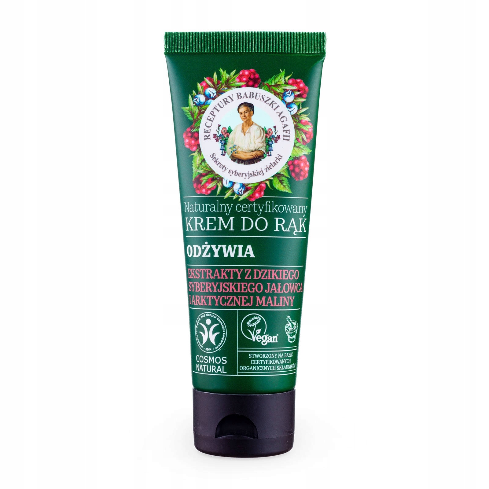 Цей крем для рук створений за традиційними рецептами травниці Бабушки Агафії для кращого стану шкіри рук. Унікальна сила трав, що містяться у формулі, пояснюється суворим кліматом дикого і незайманого Сибіру. Крем робить шкіру рук живою, м'якою та бархатистою на дотик. Екстракт дикого сибірського ялівцю, багатий органічними кислотами, ефективно пом'якшує і живить шкіру, роблячи її ідеально гладкою. Екстракт лісової малини, завдяки високому вмісту вітаміну С, робить шкіру оксамитовою гладкістю. Екстракт квітів жасмину має заспокійливу дію та знімає подразнення. Косметика містить 98% інгредієнтів натурального походження і підходить для веганів. Ідеальна місткість для сумочки. Нехай Вас береже Бабушка Агафія! Ще в дитинстві Агафія Єрмакова допомагала бабусі збирати цінні тайгові трави. Захопившись фітотерапією, вона навчилася використовувати рослини для оздоровлення та краси. Розроблені нею рецепти, багаті унікальними сибірськими травами, дозволили створити цю косметику. Сила сибірських активних речовин! До складу крему входять: соняшникова олія, екстракт ялівцю сибірського, екстракт арктичної малини, екстракт квітів жасмину, екстракт полину, екстракт медунки плямистої, вітамін Е.