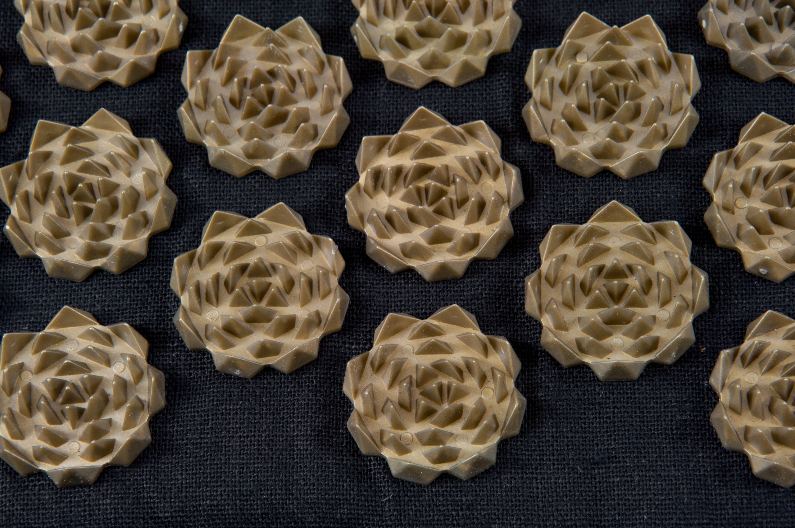 Килимок оснащений СПЕЦІАЛЬНИМИ ГІПОАЛЕРГЕННИМИ СПИНКАМИ. Завдяки цій технології шипи, форма яких нагадує обертовий вихор, під час м'яких рухів Вашого тіла викликають скручування шкірних тканин і фасцій, розслабляючи їх. Тисячі шипів на поверхні килимка стимулюють тканини виділяти ендорфіни, які мають болезаспокійливу дію, приносячи полегшення хворим і втомленим м’язам.