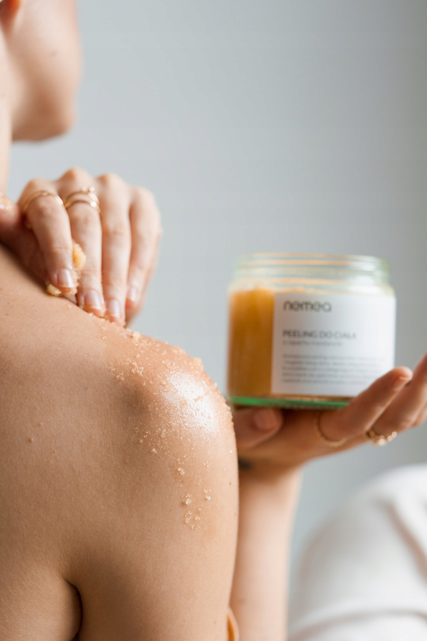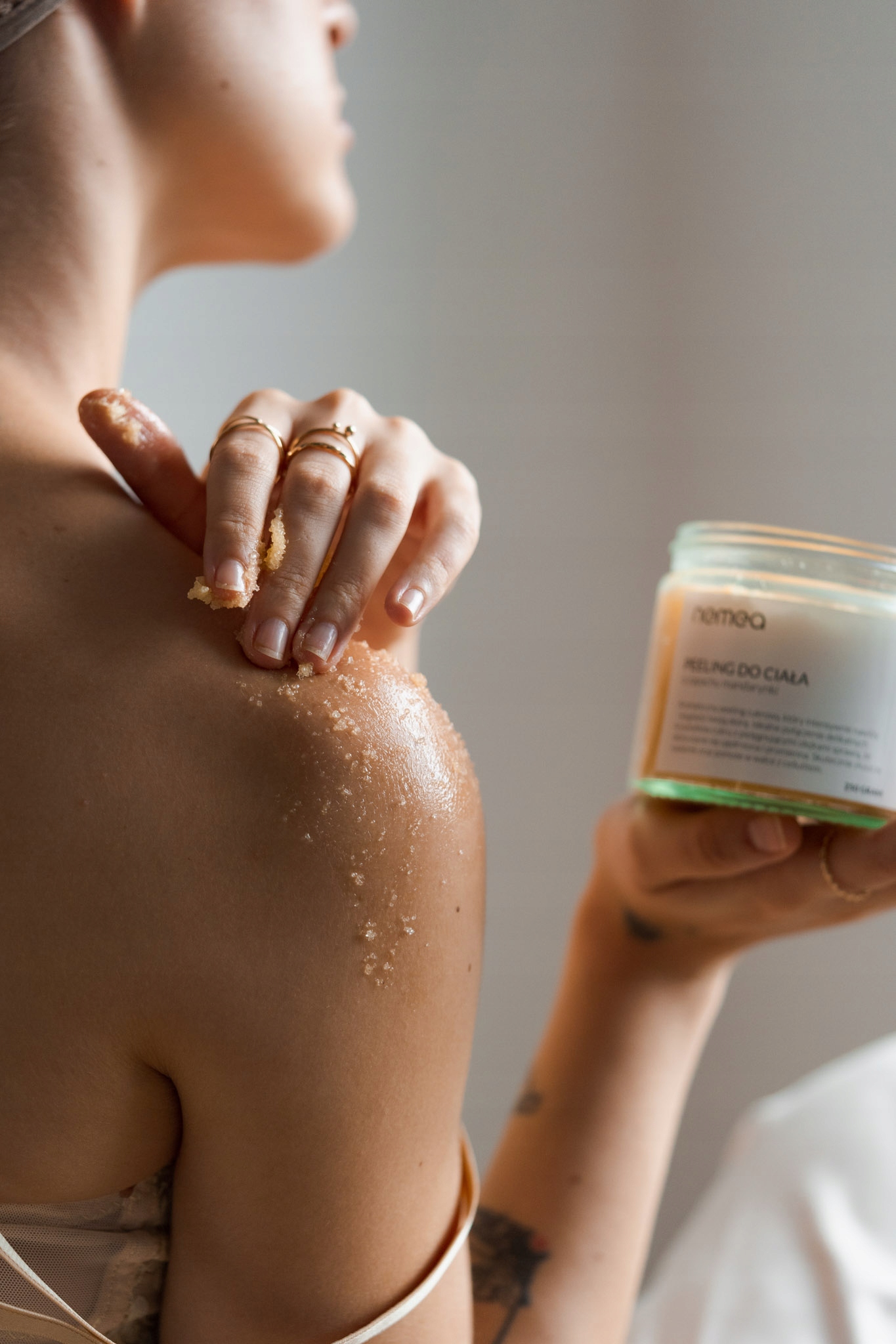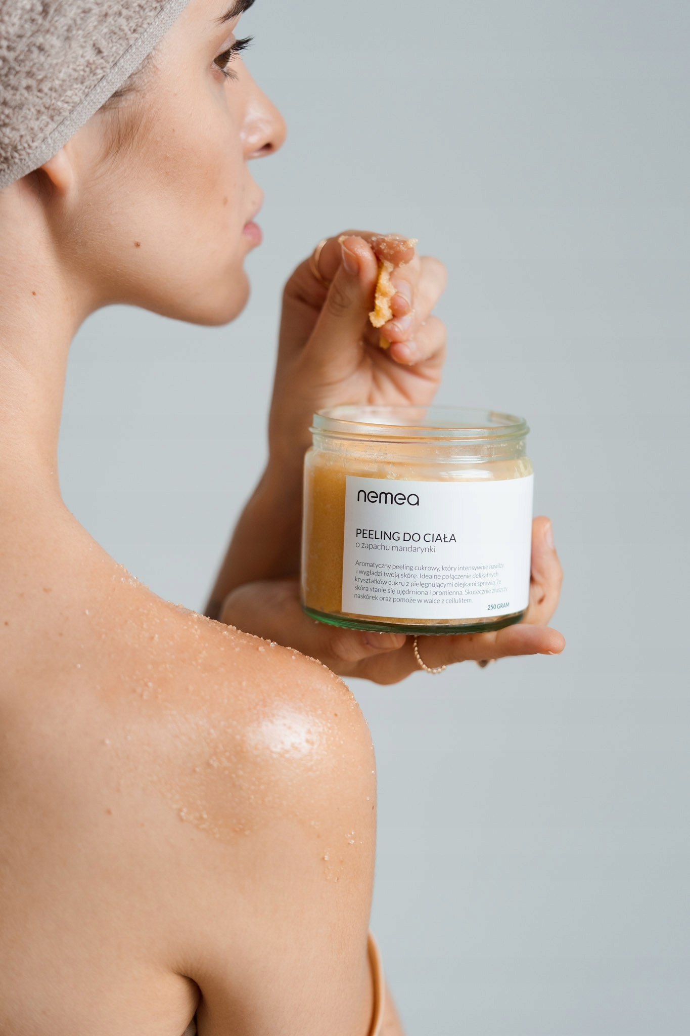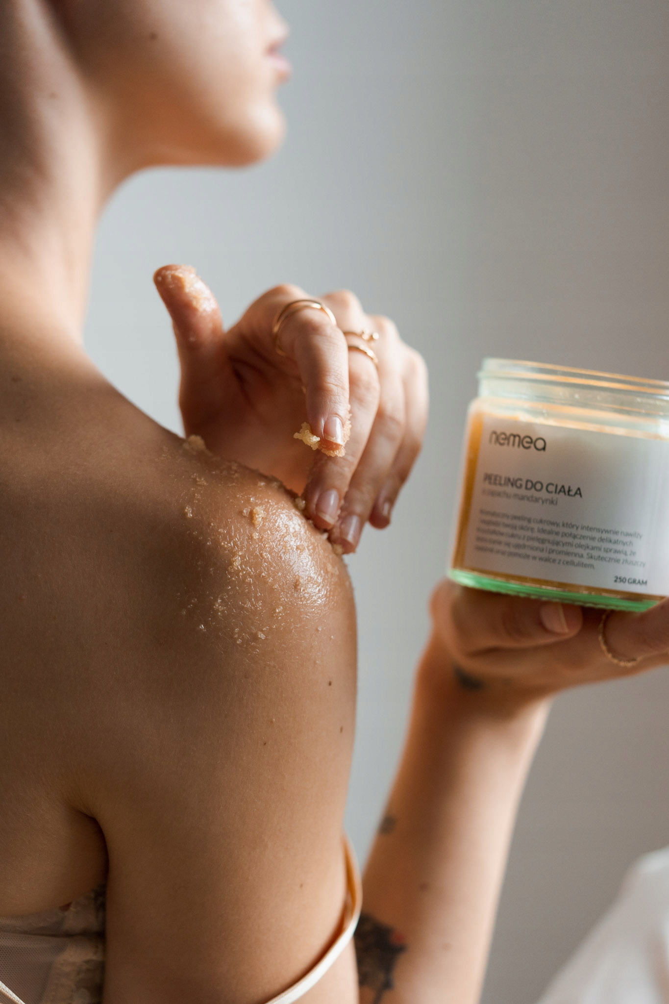 - Нанесіть невелику кількість пілінгу на вологу шкіру тіла і втирати круговими рухами. , а потім ретельно змити теплою водою.