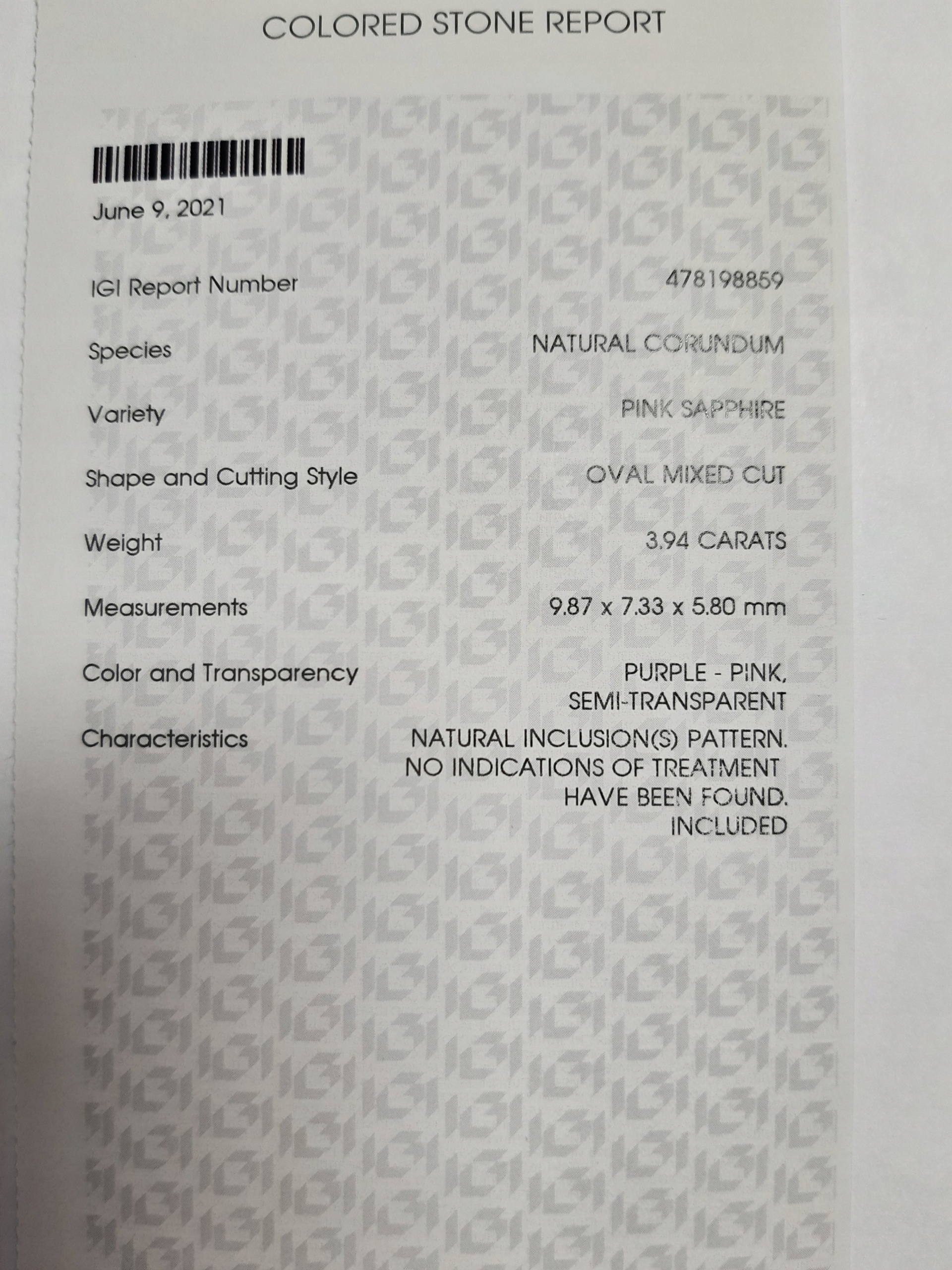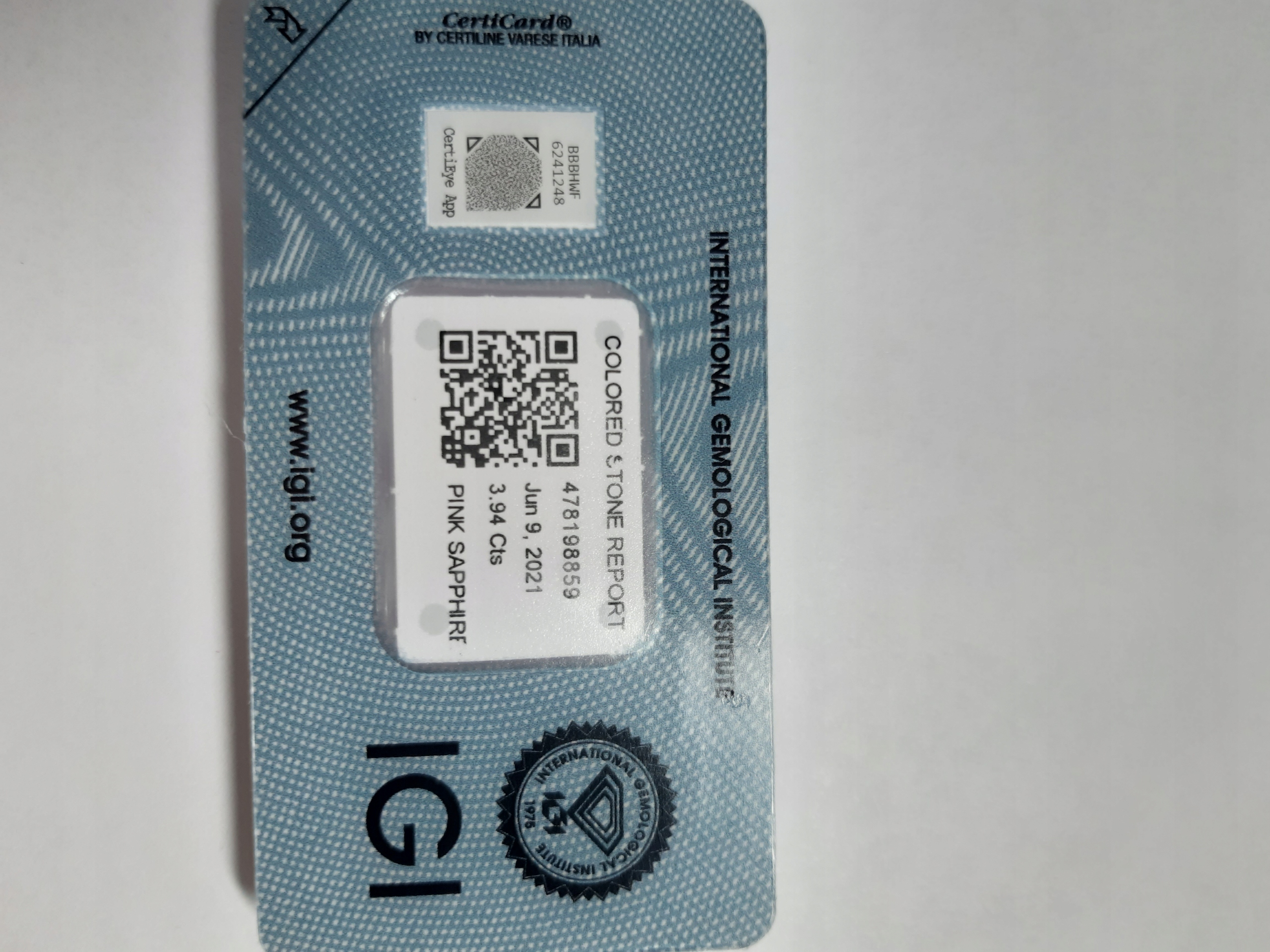 НАТУРАЛЬНИЙ РОЖЕВИЙ САПФІР 3,94 ct IGI СЕРТИФІКАТ