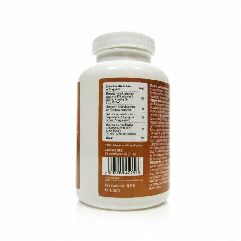 Отже, окрім активних речовин, таких як вітамін С, ехінацея, гінгерол і куркуміноїди, ви знайдете лише желатин як оболонку капсули та речовину, що запобігає злипанню, необхідну для підтримки належної форми активних речовин.