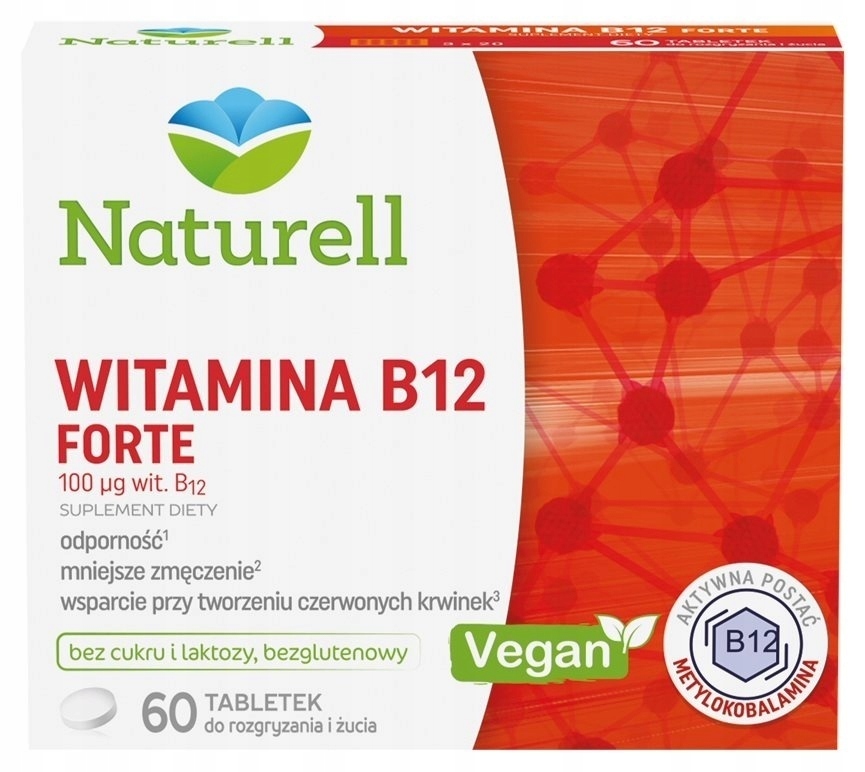 харчова добавка Naturell Вітамін В12 Форте містить вітамін В12 у вигляді метилкобаламіну. Метилмобаламін - це активна форма вітаміну В12, тому він не потребує участі всіх ферментів, необхідних для перетворення біологічно неактивної форми в активну. Завдяки цьому, це характеризується більш високою біодоступністю, порівняно з ціанокобаламінами.