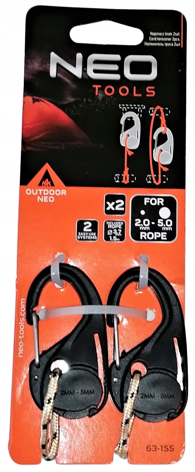 Набір з двох натягувачів мотузки від бренду NEO, пропонується в комплекті з паракордовою мотузкою 3,5 мм х 2,4 м. Це універсальні інструменти, корисні у багатьох різних ситуаціях. Вони призначені для ліній перетином від 2 до 5 мм. Натягувачі з нейлону (корпус) і сталі (пряжка) дозволяють застібати та зачіплювати шнури без необхідності знати вузли. Міцна, але легка конструкція елемента забезпечує комфортне використання протягом багатьох сезонів.