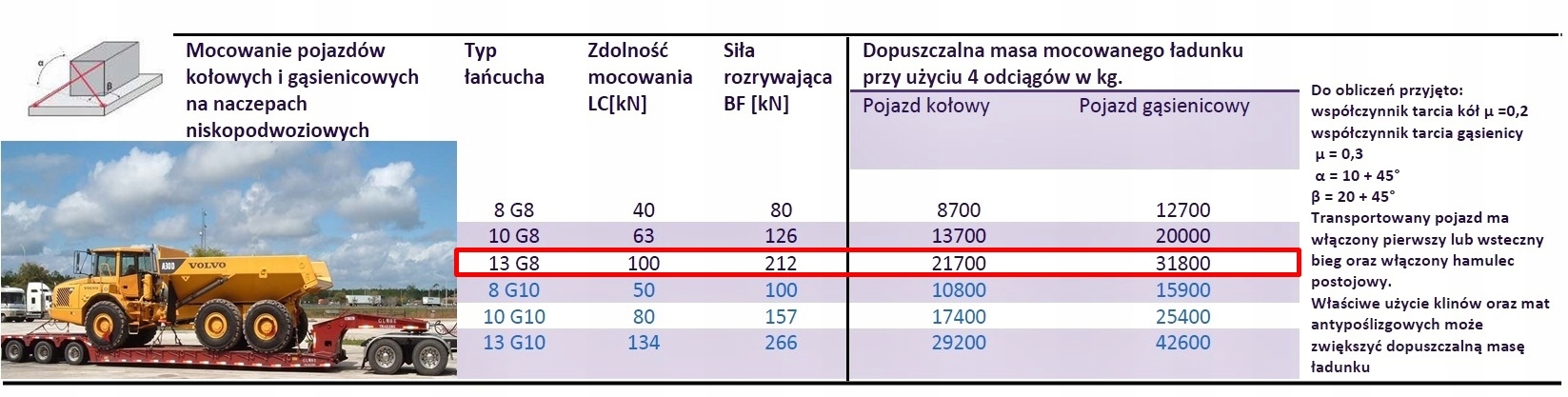 ЗАСТОСУВАННЯ: натягувач ланцюга та кріплення ланцюга використовуються для надійного кріплення важких вантажів, таких як важкі машини, військова техніка, або небезпечних і важких для транспортування вантажів, таких як дерево або сталь, конструктивні елементи, як у наземний і морський транспорт. Широке застосування в транспорті, логістиці, на кораблях і у військових пристроях. Таблиця допустимої ваги вантажу, закріпленого за допомогою транспортно-натягувачів ланцюга, нижче.