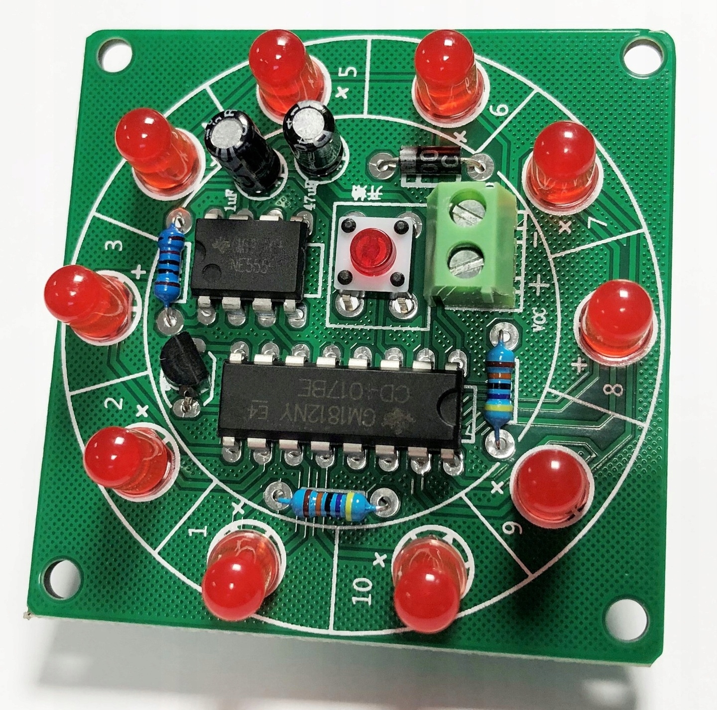 Система на базі чіпів NE555 CD4017, схема складання компонентів надрукована на платі.