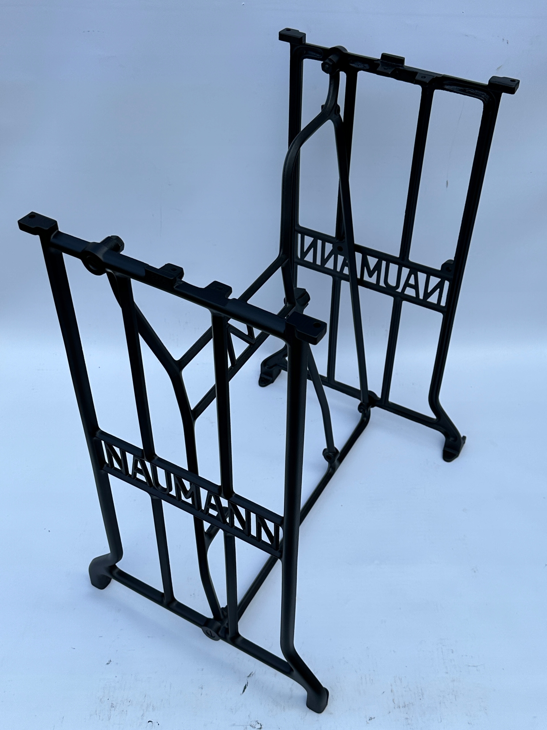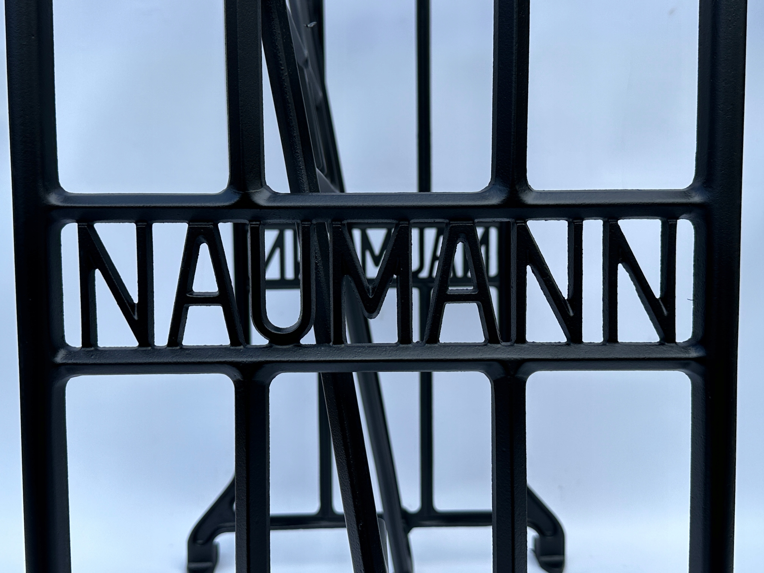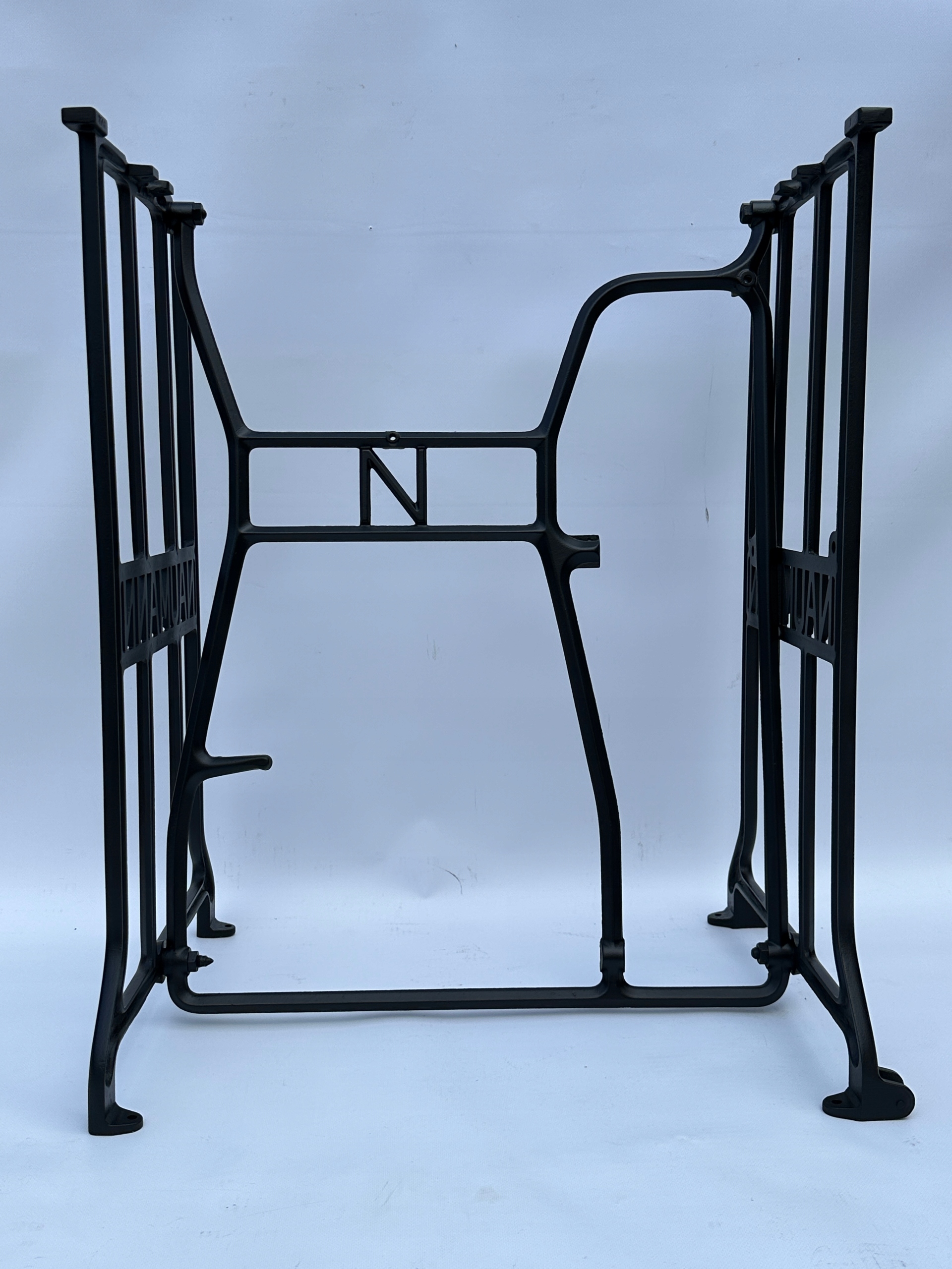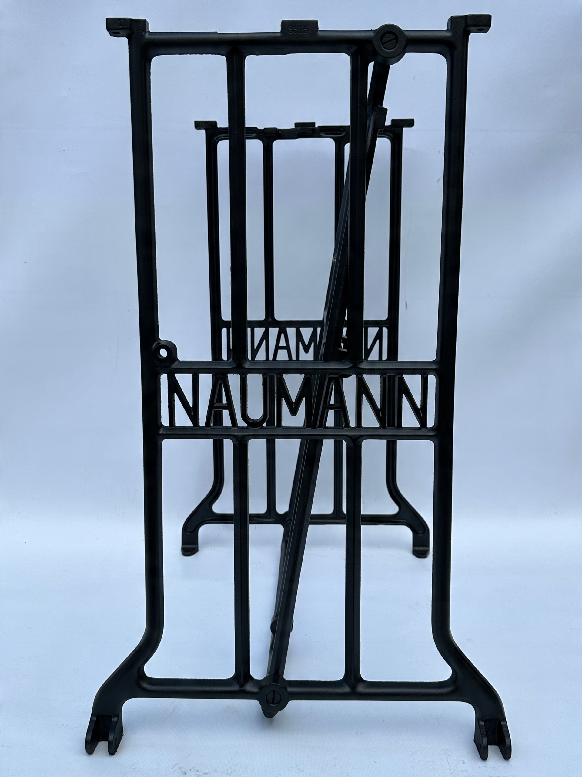 Предмет продажу стара чавунна основа від швейної машинки NAUMANN. Дуже гарний візерунок. З боків є написи з логотипом компанії, посередині N. Коліщатка в нижній частині зняті, що робить стіл більш стійким і не рухається.