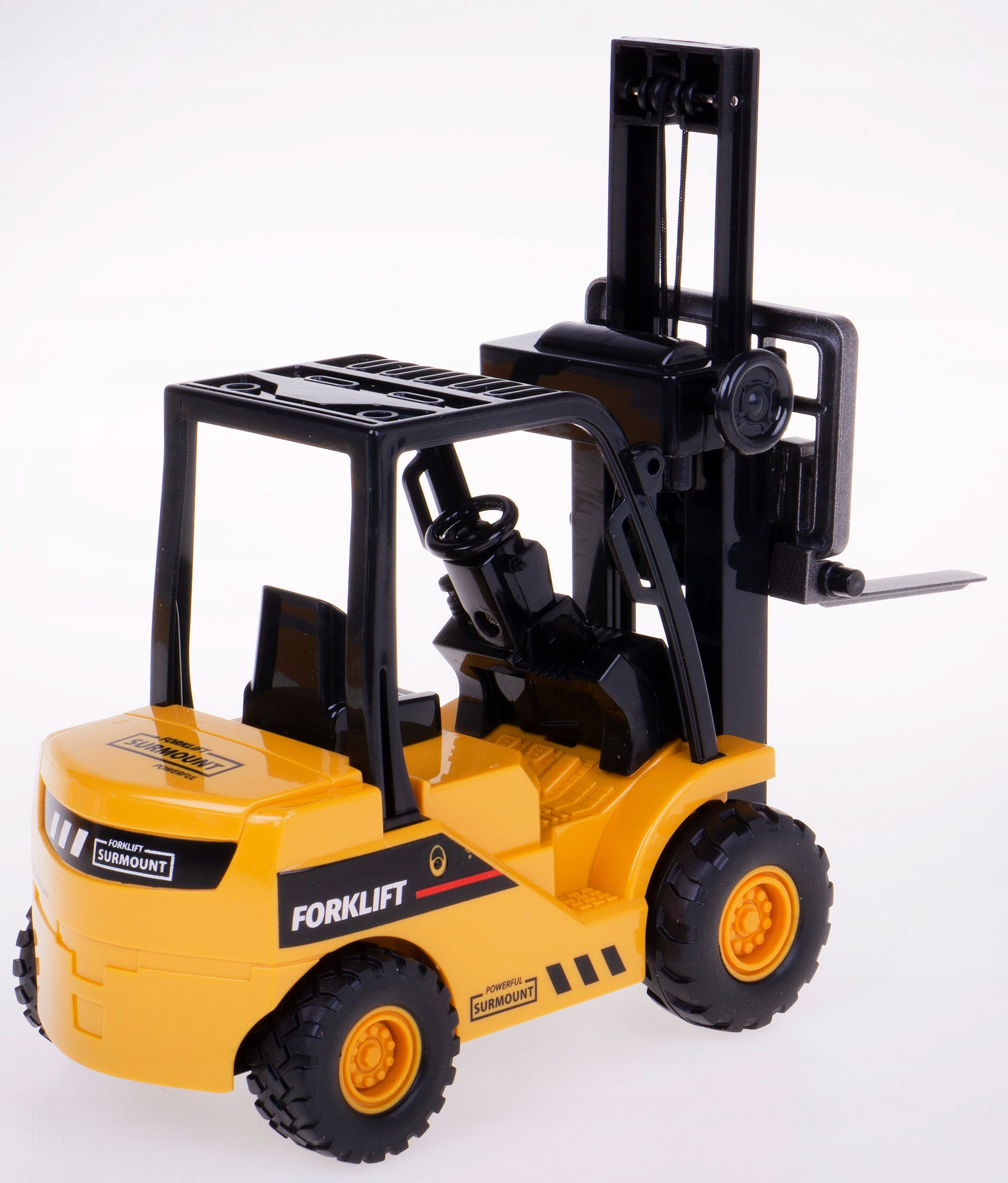 Модель навантажувача з міцного пластику з металевими відкидними вилками з відкатним приводом на гумових шинах.