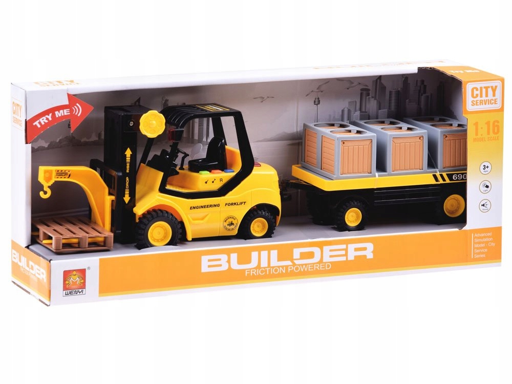 Вилочний навантажувач із рухомими частинами необхідний на кожному складі. Ця комплектація повністю виготовлена з пластику, має рухомі елементи, світлові та звукові ефекти, витримує будь-яке навантаження.