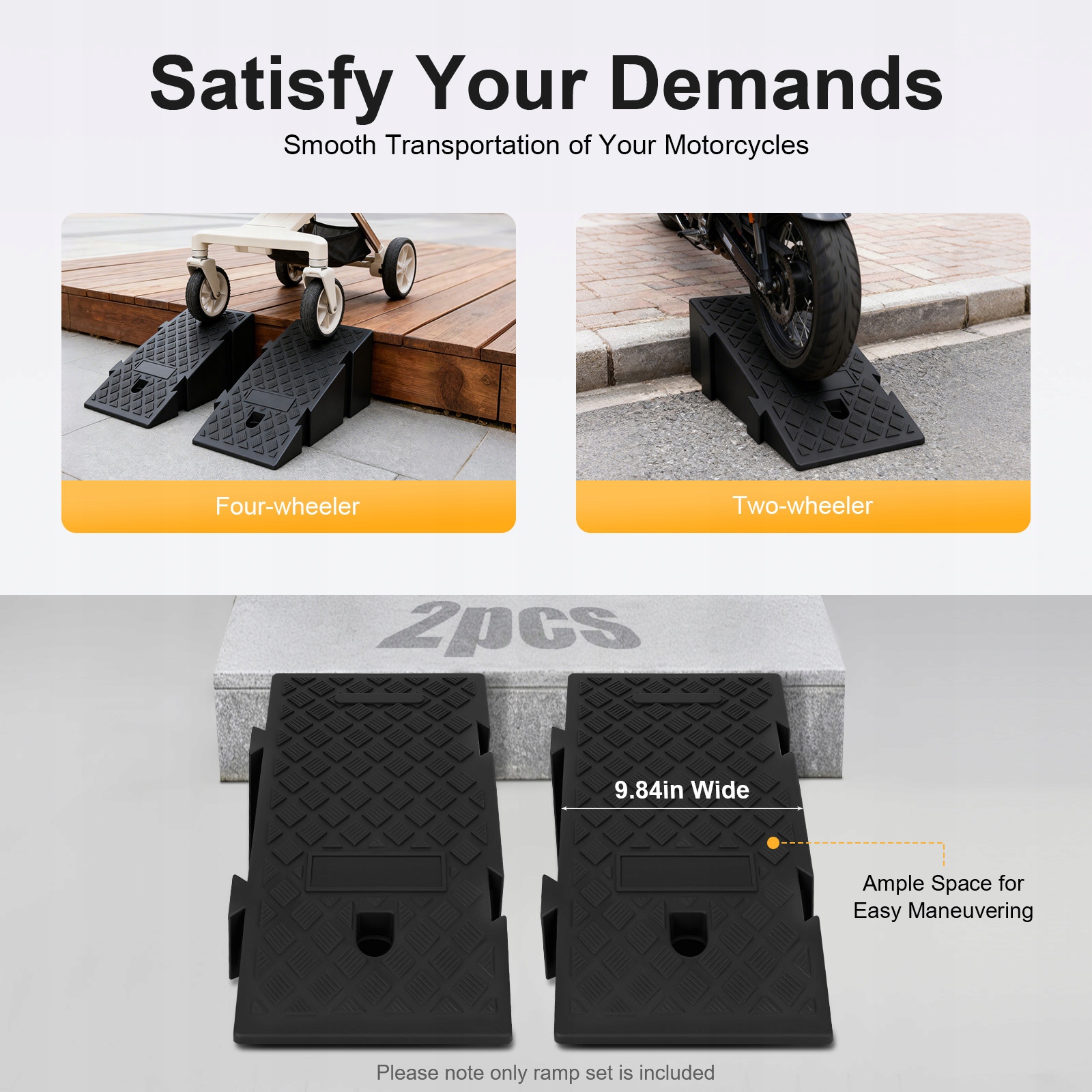 ✅✅Задовольнити ваші потреби: У комплект входять два пандуси, кожен розміром 9,84 дюйма в ширину, що забезпечує достатньо місця для легкого маневрування, незалежно від того, використовуєте ви чотириколісний або двоколісний транспортний засіб. Крім того, завдяки висоті 7,48 дюйма вони розроблені для більшості висот сходинок, забезпечуючи універсальність у різноманітних сценаріях використання.