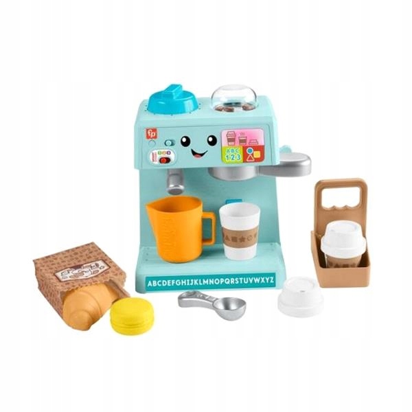 Малюки отримають масу задоволення з набором «Навчайся та смійся»! від Fisher-Price(R). Ця інтерактивна іграшка, натхненна кавоваркою, має 10 аксесуарів і понад 100 активацій: звуки, пісні та фрази про букви, кольори та форми. Діти можуть подрібнювати зерна в контейнері, нагрівати молоко в спінювачі та варити каву, щоб подати клієнтам. Завдяки 3 рівням навчання навчальні розваги ростуть разом з вашою дитиною! Натисніть кнопку глобуса, щоб вибрати мову: польська, угорська, чеська, словацька або англійська. Кольори та елементи декору можуть бути різними.