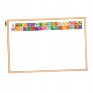 На дошці є кольоровий принт польського алфавіту з ілюстраціями предметів, які допомагають дитині розпізнавати та запам’ятовувати літери.