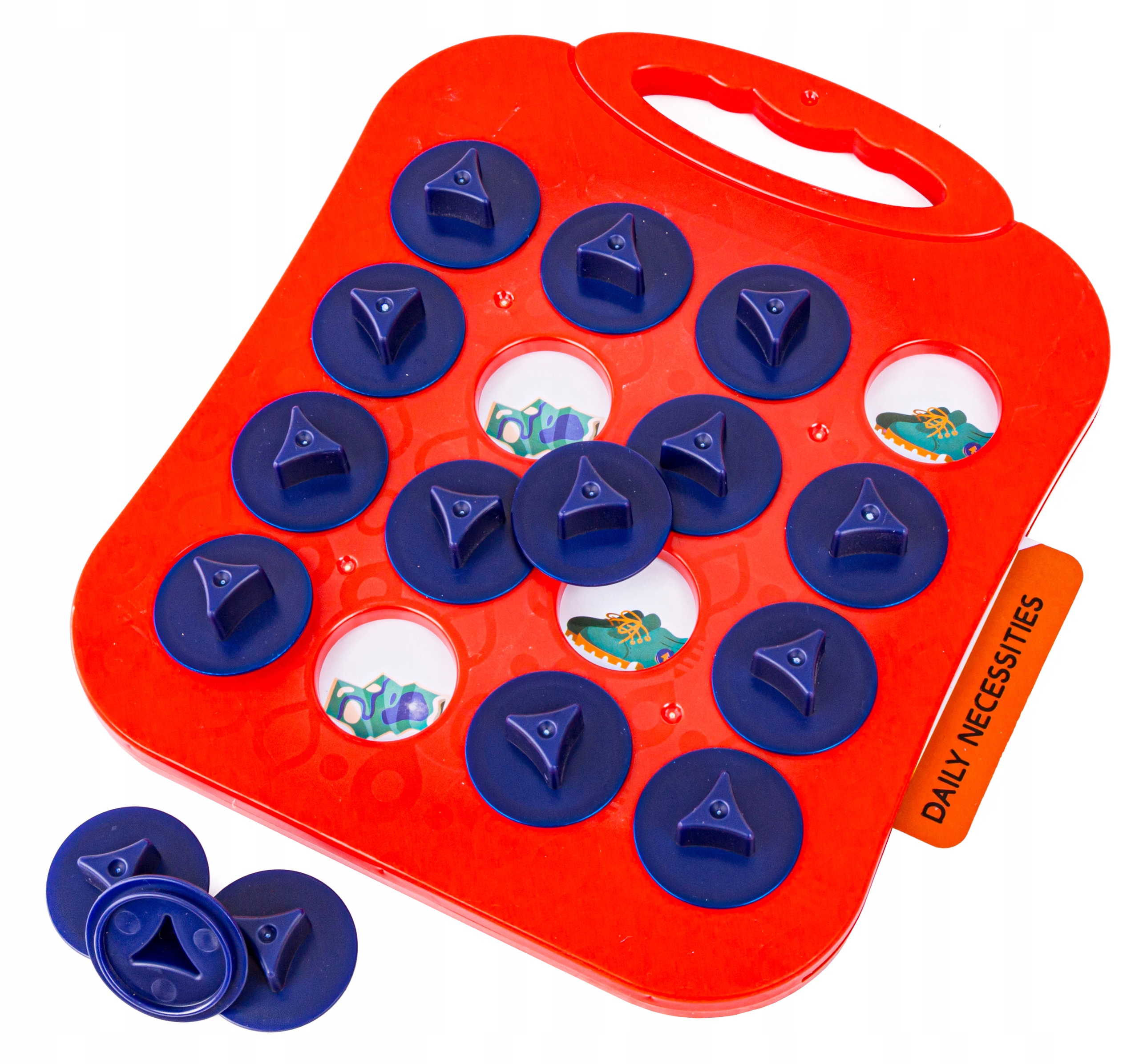 Мета полягає в тому, щоб здогадатися якомога більше пар зображень. Учасники влаштовують візерунок зображень на основі, покриваючи всі дірки. Гравці розкривають дві кнопки для початку. Якщо оголені зображення утворюють пару, програвач бере кнопки і продовжує. В іншому випадку черга переходить до наступного гравця. Нарешті, ми рахуємо зібрані кнопки, а людина з найбільшою кількістю виграє число. Ви також можете використовувати доданий пісочний годинник для збільшення труднощів гри. Набір містить до 15 різних тематичних дощок, що гарантує багато годин веселощів та навчання.