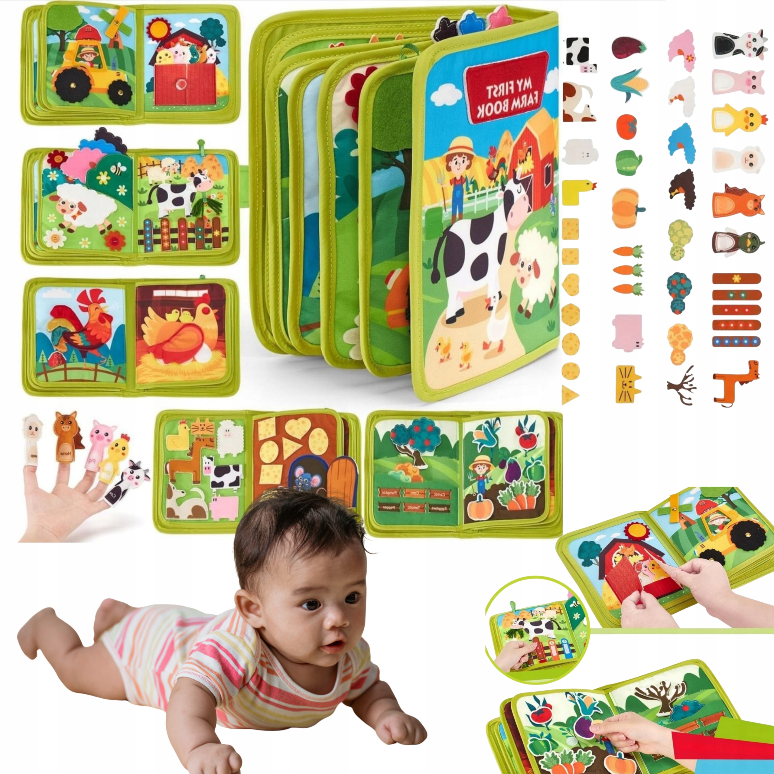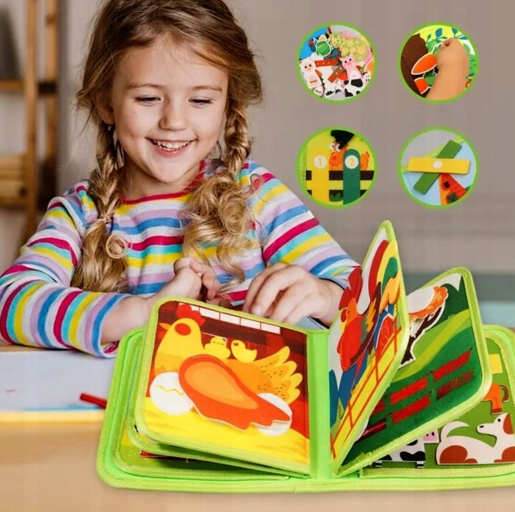 Гра з книгою — це не лише розвиток моторики, але й вивчення форм, кольорів, тварин, овочів та геометричних фігур. Крім того, сенсорні елементи – липучки, кнопки, стрічки та шнурки – сприяють когнітивному та тактильному розвитку.