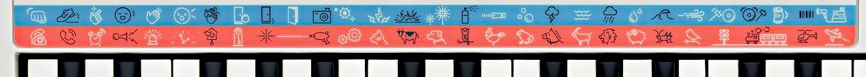 39 якісних звуків і барабанна установка забезпечать виконання будь-якої музики. Кнопки вибору звуків позначені малюнками музичних інструментів, що полегшує дітям вибір потрібних звуків.