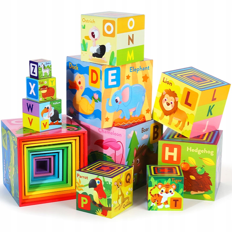Барвиста дерев'яна вежа з алфавітом — чудова розвиваюча іграшка, яка допоможе вашій дитині швидко та легко вивчити букви та назви тварин англійською мовою.