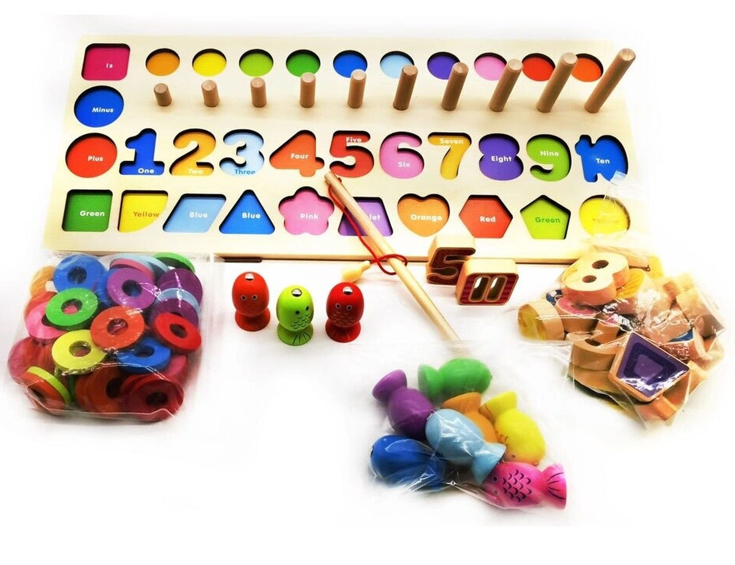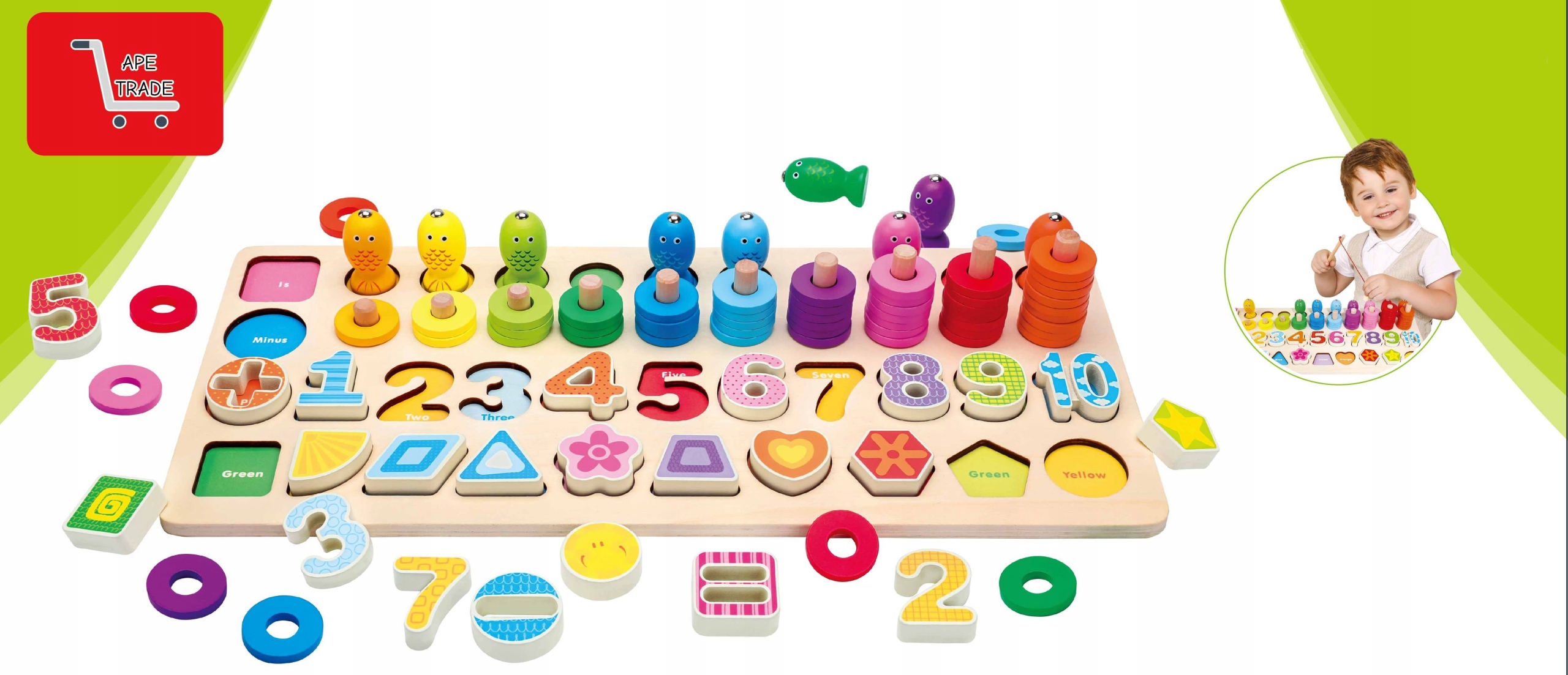 На дошці 55 різнокольорових кілець, 10 цифр, 10 дерев'яних стовпчиків, знаки: =, +, x, 10 рибок із магнітами та 10 блоків різної форми. Завдяки такому багатому набору ваша дитина буде вивчати ази математики через гру.