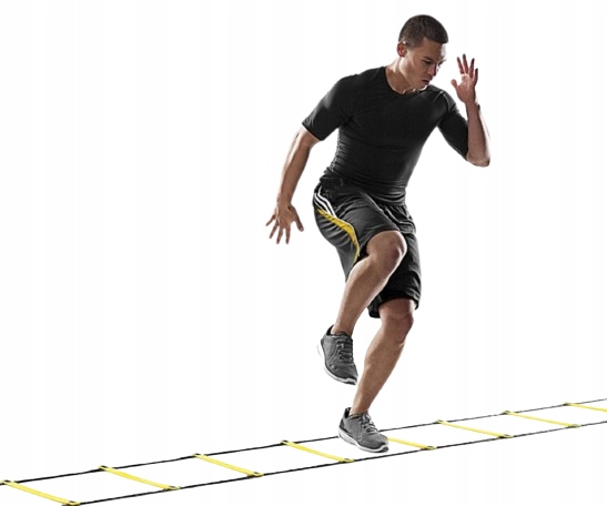 - ПРАКТИКУЄТЬСЯ КОНТРОЛЮ ТІЛА – вправи з тренувальною драбиною можна вільно варіювати та модифікувати відповідно до потреб. Зазвичай їхньою основою є якнайкоротший контакт стопи з землею – тому стрибати між щаблями потрібно якомога швидше (вперед, убік, назад).