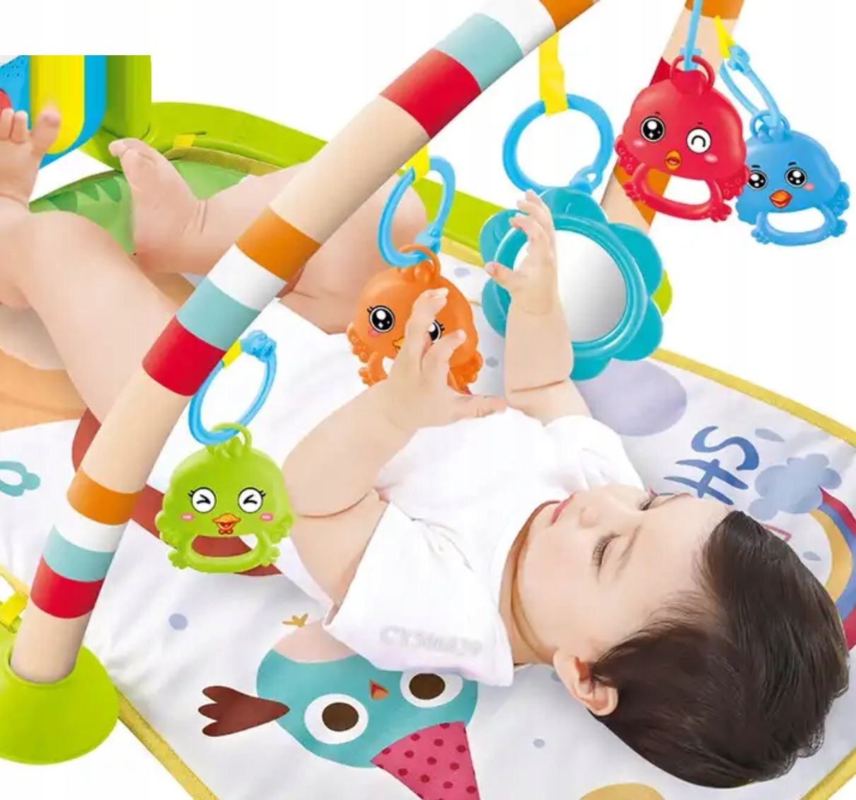 - Килимок має прикріплену пов’язку з різнокольоровими брязкальцями та дзеркалом, лежачи дитина може грати на піаніно ногами