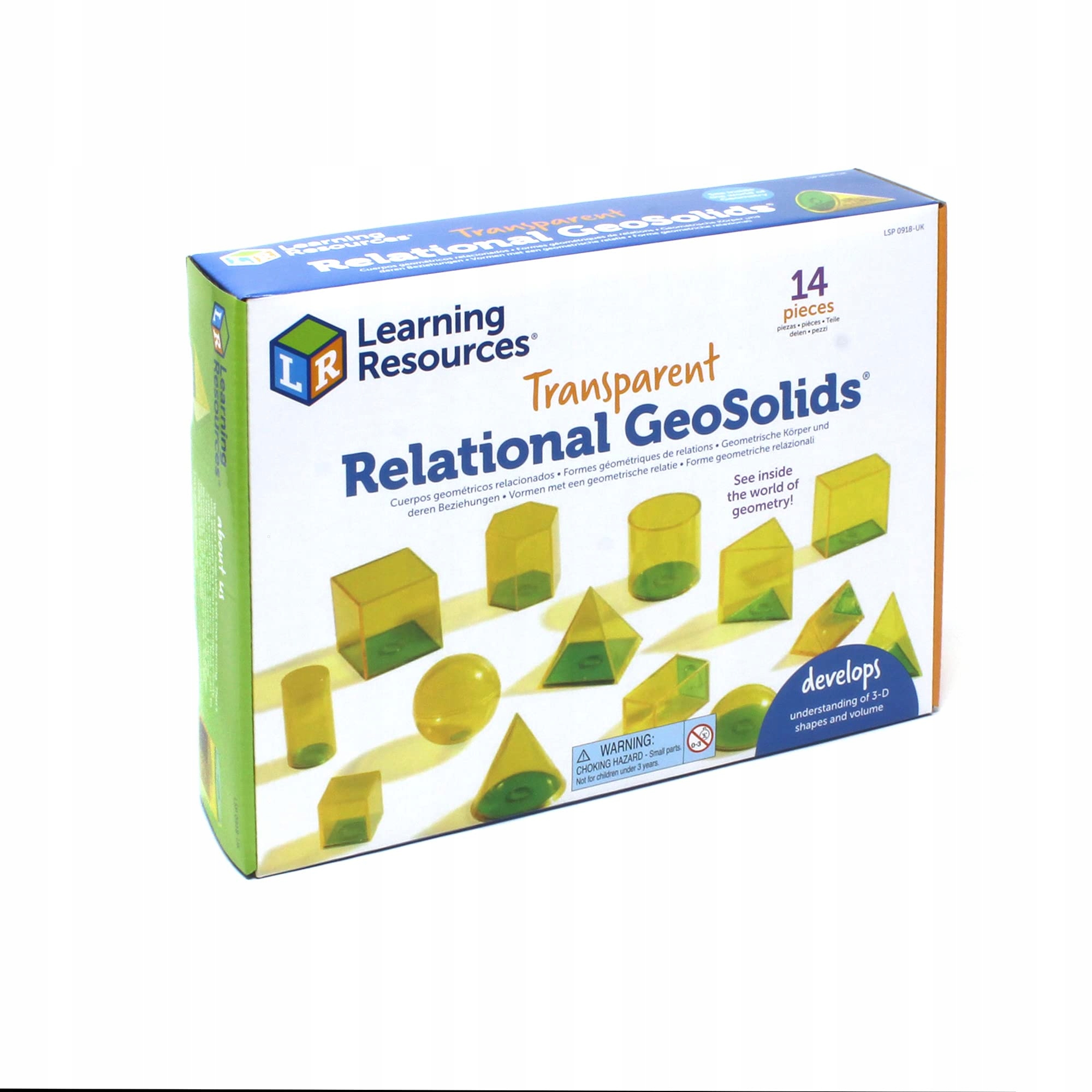 Навчальні ресурси Реляційні геосоліди викладають форми, розміри та об'ємні відносини з пластичними, напівпрозорими геометричними формами. Ці 3D -ресурси математики порожні та мають знімні пробки, які дозволяють користувачеві заповнити їх рисом або піском. Набір включає 14 форм, що стосуються розмірів, складених із сфер, шишок, кубів, прямокутників, циліндрів, пірамід та багатогранних. Включає посібник з діяльності. Форми вимірюють 5 см. Віком 8+.