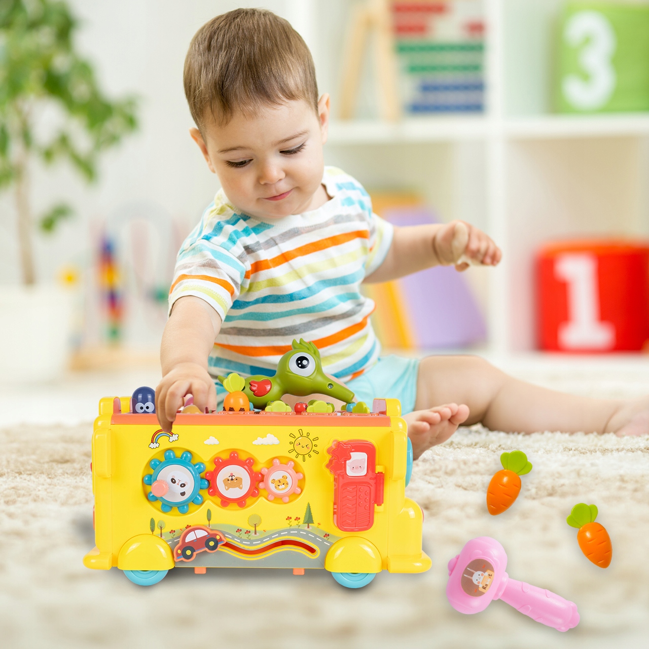 Крім того, на даху автомобіля є різнокольорові елементи - дитина може їх натискати або бити молотком. Ця функція забезпечує варіативність і різноманітність у грі, одночасно розвиваючи ручні навички малюка та координацію рухів.