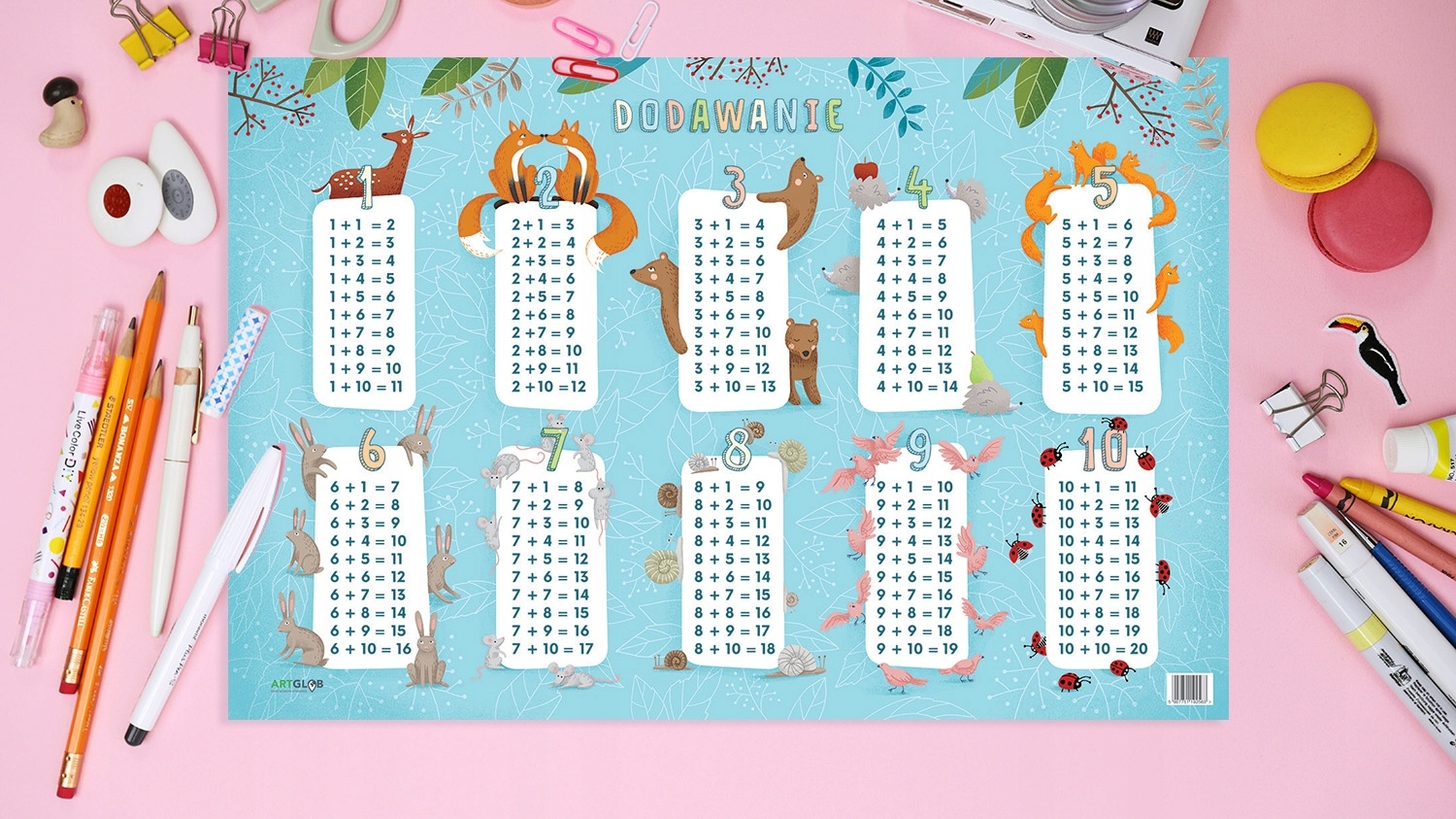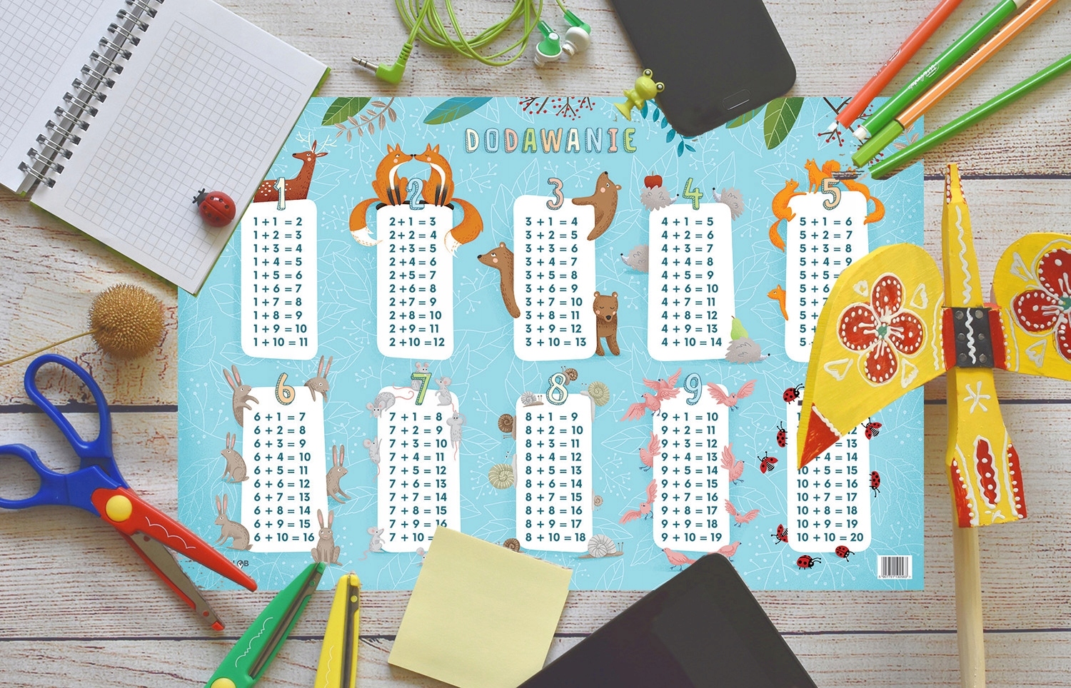 Багаторазовий блокнот для доповнення до навчання, ідеальний для кожного дошкільника та учня початкової школи. Подаруйте своїй дитині унікальний інструмент, призначений для вивчення математики з перших днів навчання. Приваблива форма виробу, анімаційні ілюстрації та яскраві кольори швидко викличуть інтерес у вашої дитини. Блокнот містить набір математичних вправ, які покращують уміння додавати від 1 до 20. Інша сторона містить подібні вправи. І не хвилюйтеся - ми обрамили колодку блискучим ламінатом. У поєднанні з маркером для сухого стирання це створить вічний дует, який не боїться жодних помилок. Все, що вам потрібно зробити, це... стерти його! Крім того, підкладка буде служити захистом для стільниці будь-якої дитячої парти.