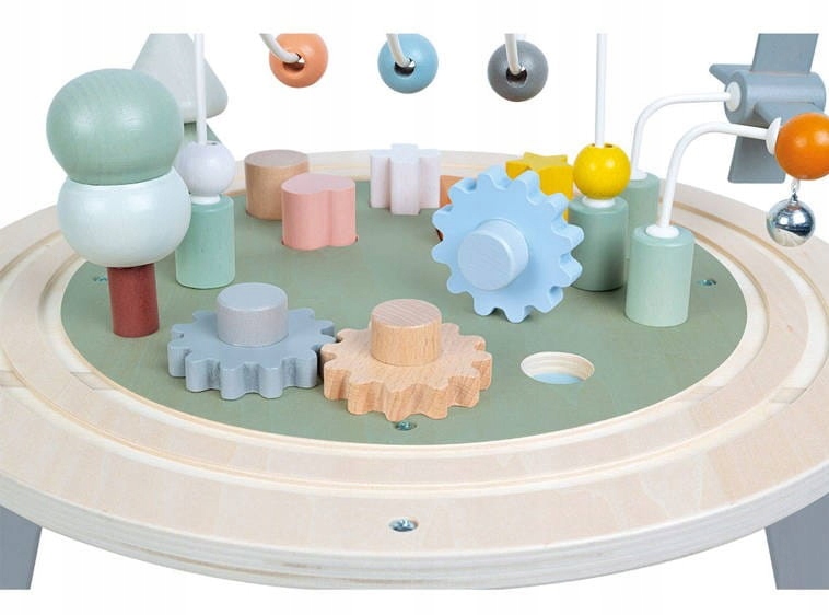Елементи на стільниці створюють чарівний мікросвіт в якому є доріжка для 2 автомобілів, що входять в комплект, петля з 6 кульками для пересування, дві металеві штанги - одна з обертовим дерев'яним вітряком, інша з кулькою з дзвоном ( транспортні засоби врізалися в нього під час руху по доріжці), 3 зубчастих колеса, 5 блоків різної форми - для розміщення у відповідних отворах (функція сортування) та два дерева - піраміди з елементи корони для зняття і одягання (по 2 на кожен).