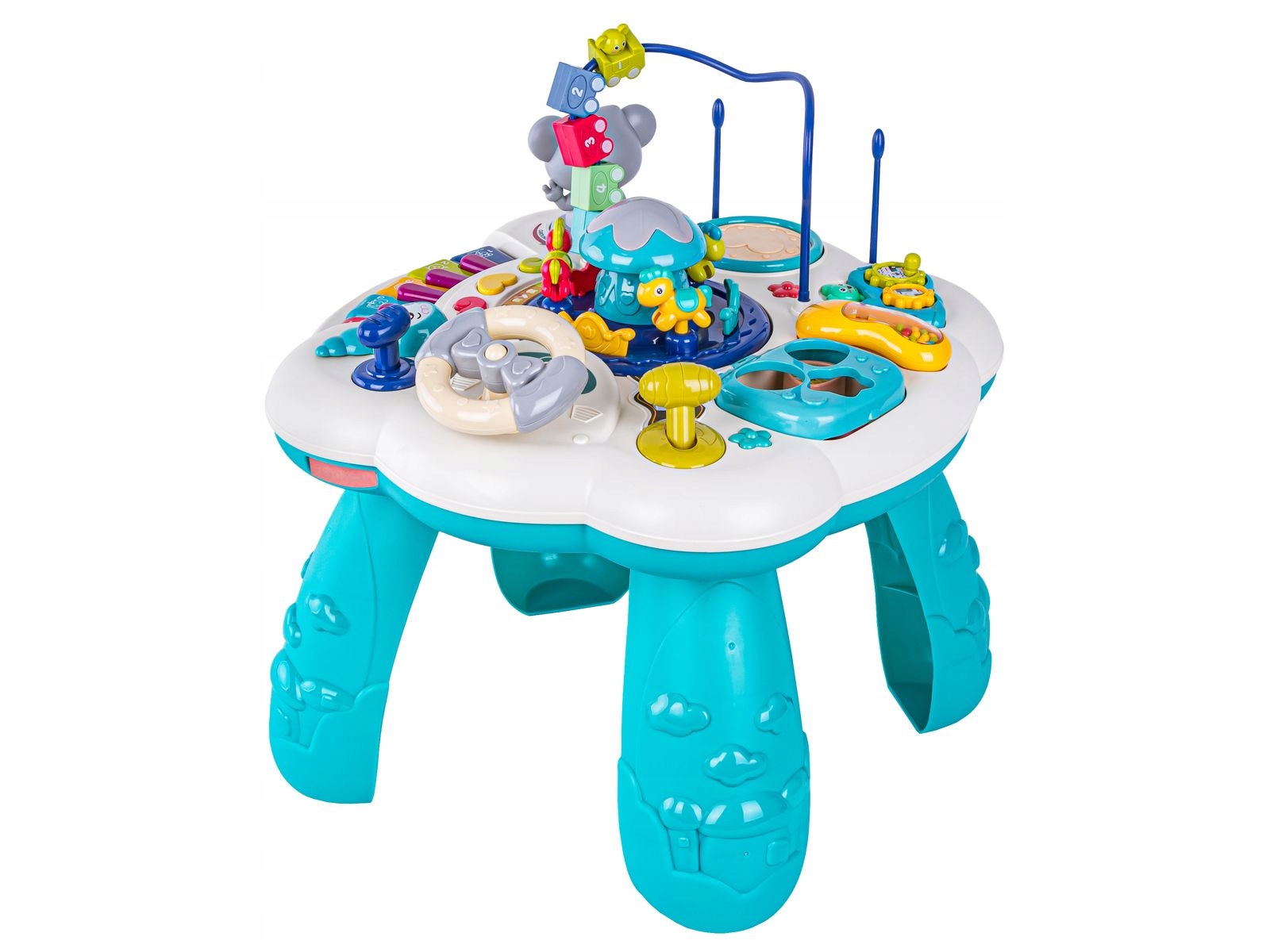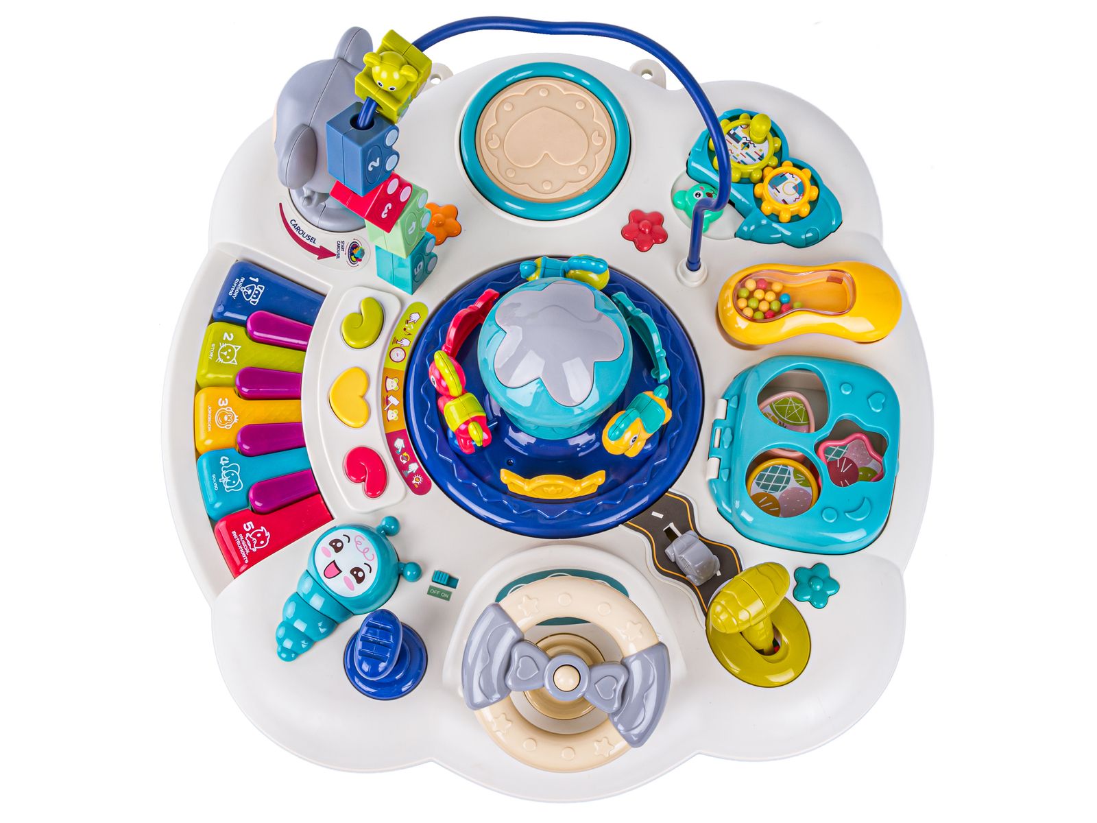- Навчальний інтерактивний дитячий столик + піаніно синього кольору — надзвичайно універсальна іграшка, яка принесе вашій дитині багато годин радості та навчання. Оснащений багатьма атракціонами, такими як карусель, кермо, що обертається, важіль коробки передач, ручка з різнокольоровими кубиками, телефон-брязкальце, міні-органи з підсвічуванням, кольорові шестерні, міні-барабан і сортувальник для блоків різної форми, стіл розвиває ручні навички, координацію рухів, здатність розрізняти форми та кольори, креативність, уяву та логічне мислення. Розроблений з думкою про безпеку дітей, виготовлений із сертифікованих матеріалів, без гострих країв і нерівностей. Можна використовувати як столик після установки ніжок або як самостійну іграшку. У комплект входить основна панель, 4 ніжки та оригінальна упаковка. Продукт відповідає стандартам безпеки та має сертифікат CE. Завдяки цій таблиці малюк розвивається абсолютно безпечно та розвивається.