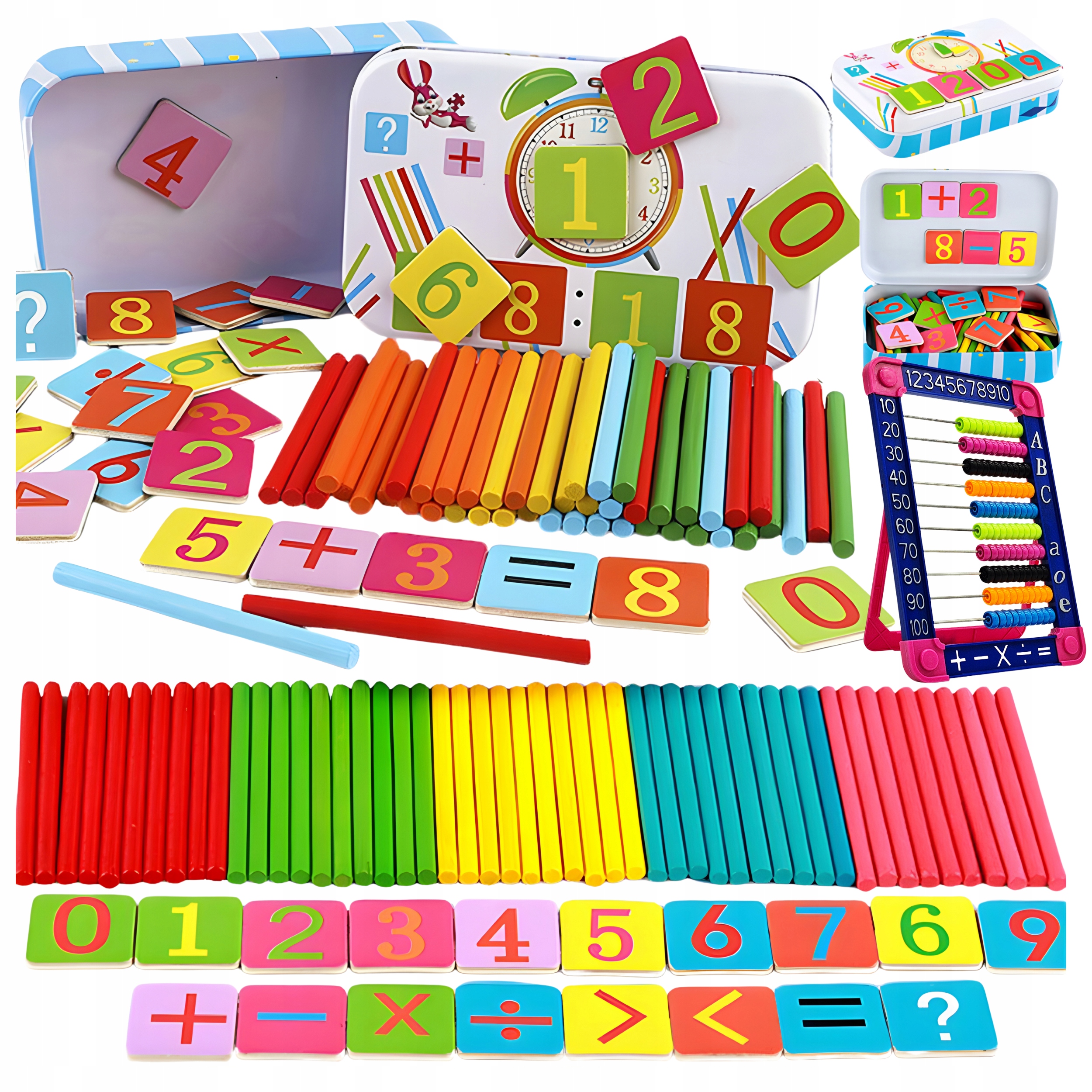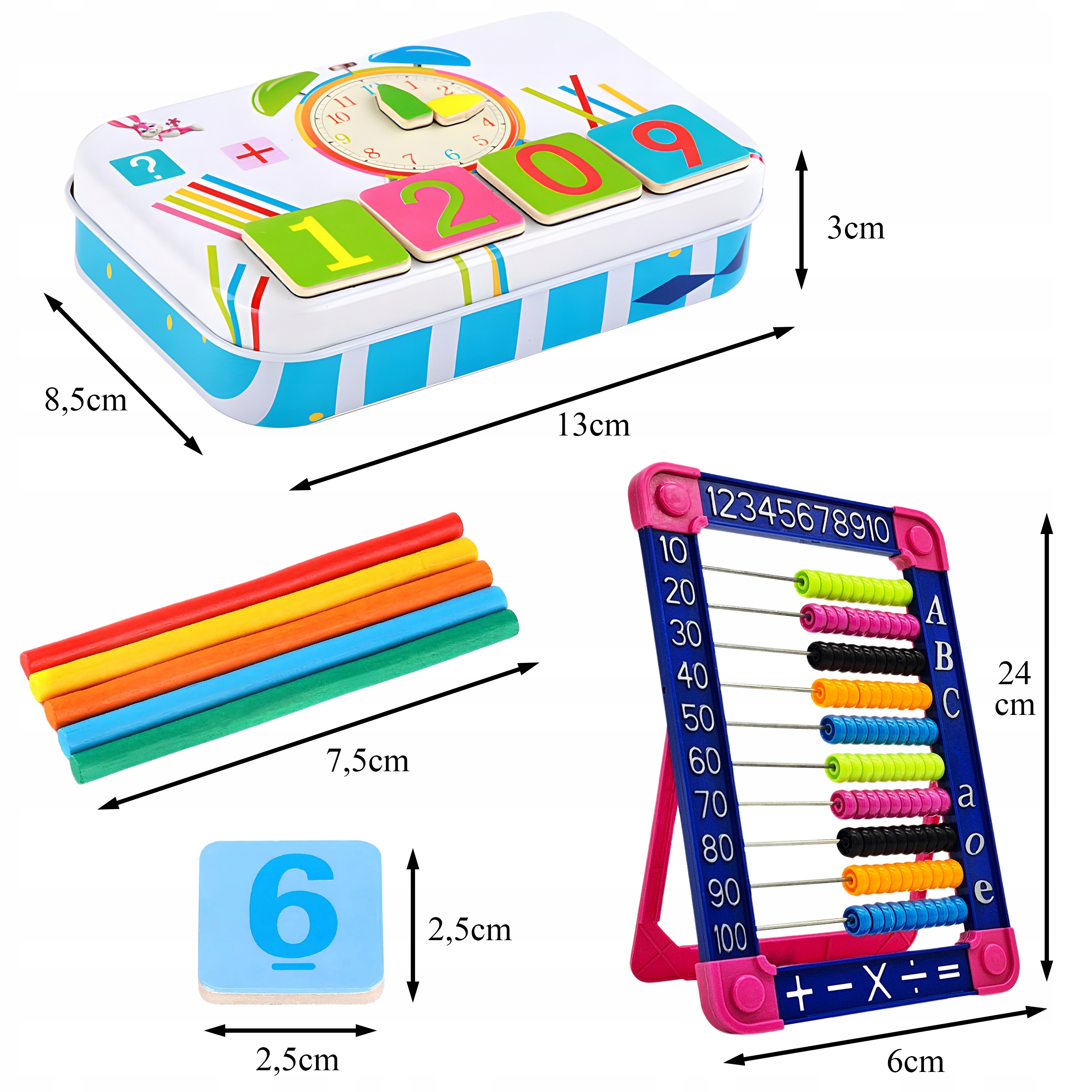 Цей унікальний навчальний набір поєднує в собі класичні рахівниці, картки з числами, рахункові палички, кольоровий годинник і багато математичних аксесуарів, які допомагають вашій дитині розвивати логічне мислення та розуміти основи рахунку.