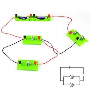 Набір дозволяє вивчати та практикувати замкнуті та розімкнуті кола електричного струму, а також послідовні та паралельні схеми.