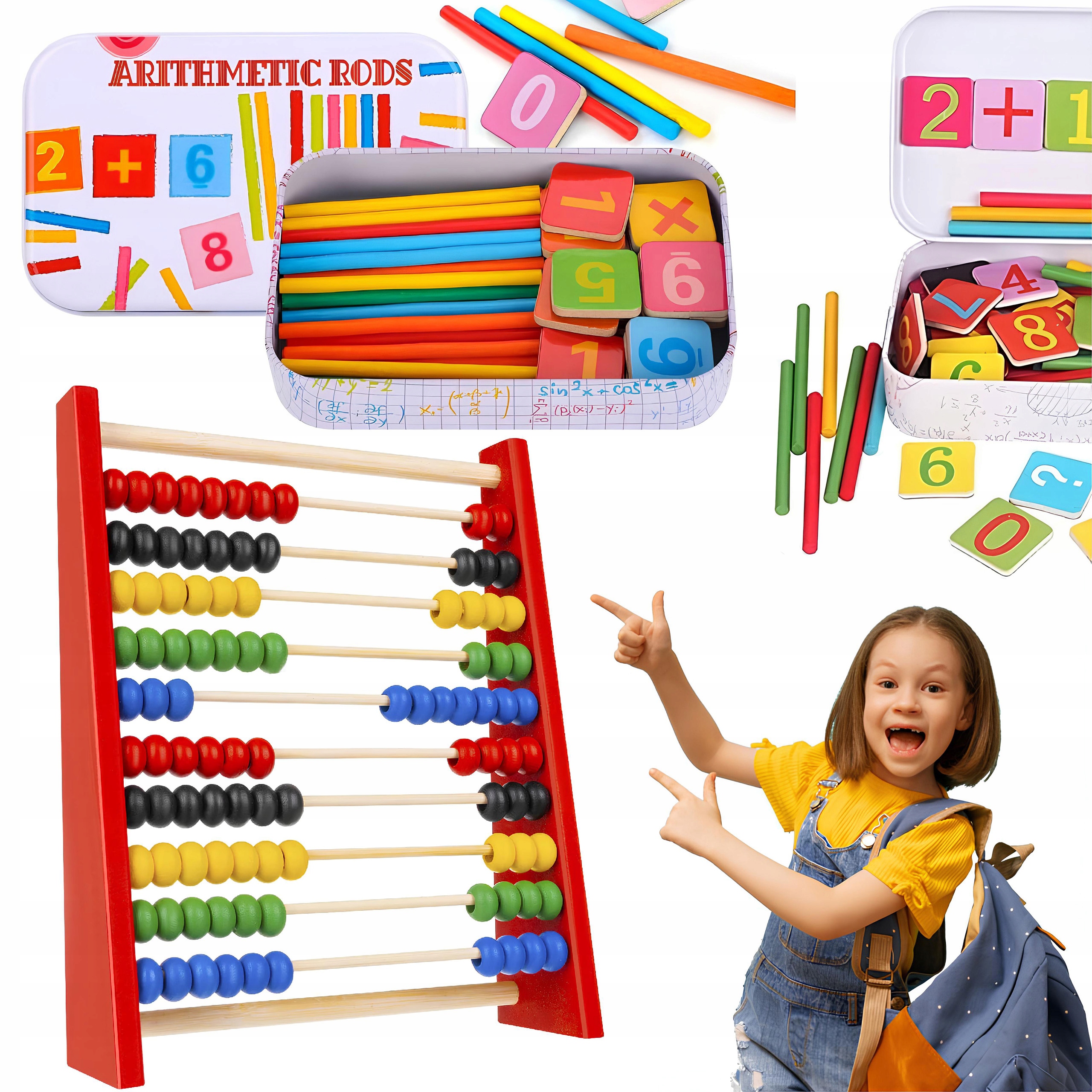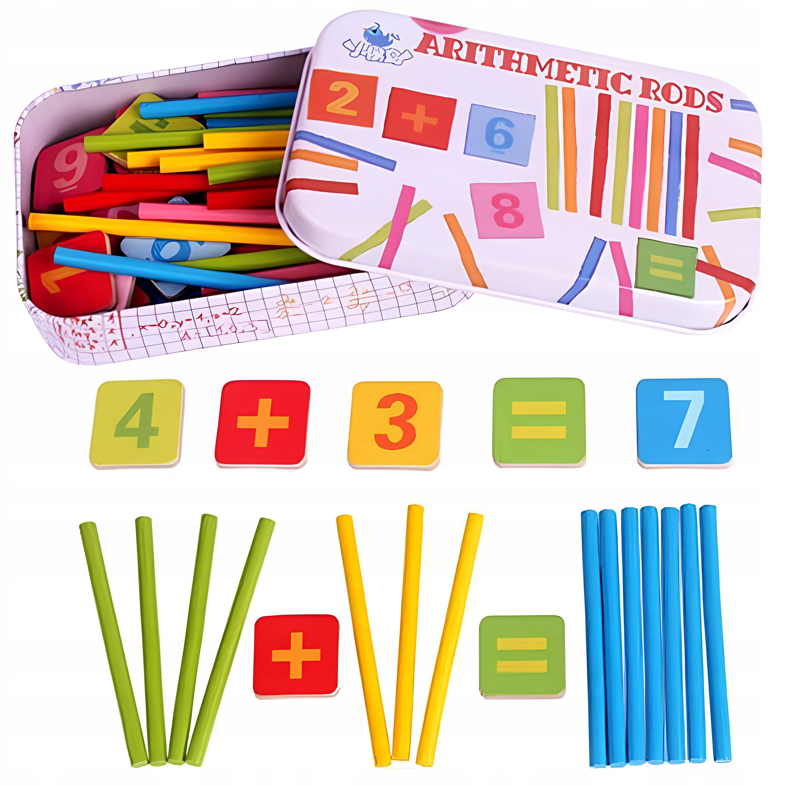 4 Ми рекомендуємо насамперед дітям, які відвідують дитячий садок, та перші класи початкової школи, а також навчити дітей, які розпочнуть свою пригоду лише з математики.➡ палички - набір паличок містить елементи з математичними знаками, цифрами. Ціле загорнуте в металеву банку/ організатор. Набір містить 10 паличок, виготовлених з кольору.
