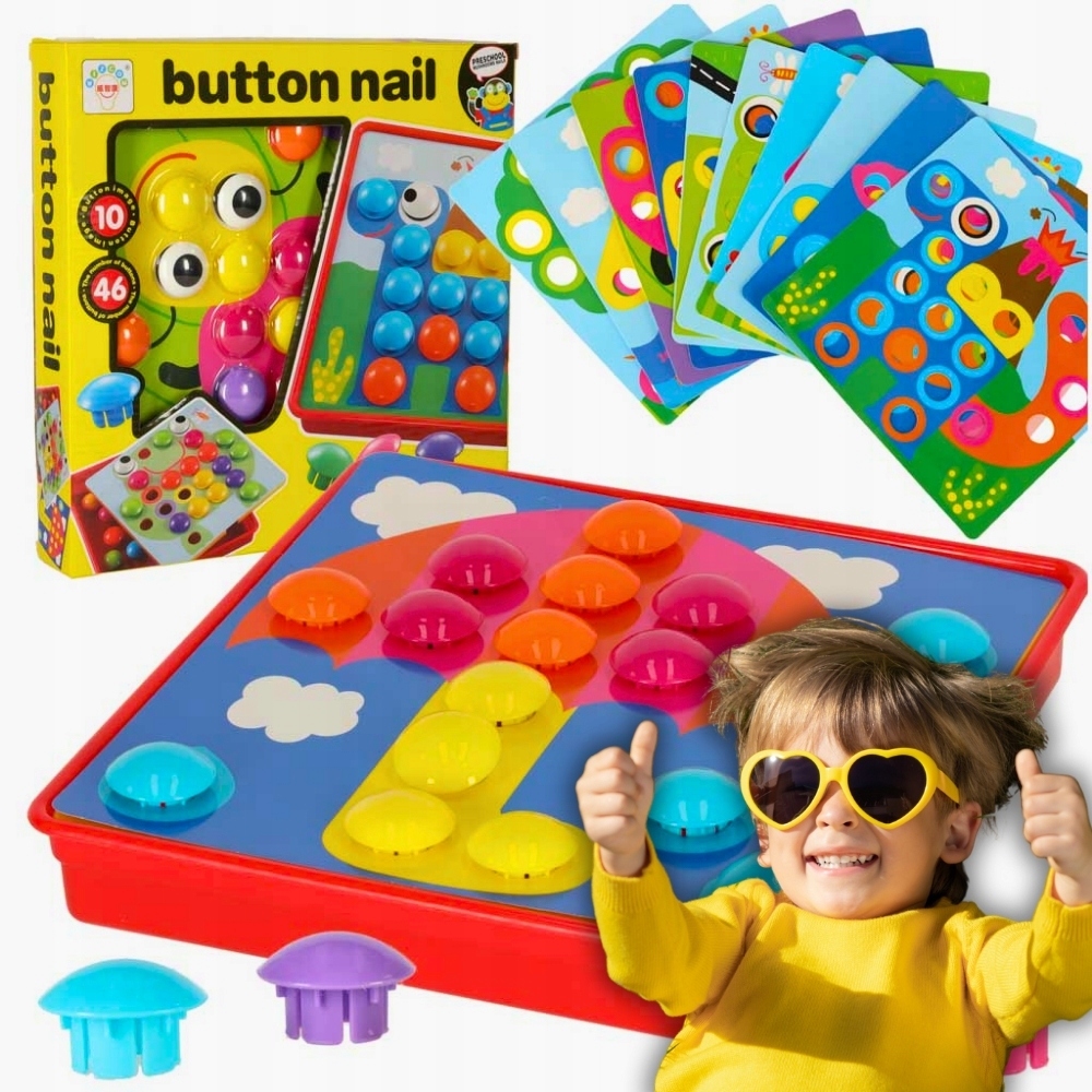 Набір містить 10 дошок із зображеннями та 46 ґудзиків різних кольорів, завдяки яким дитина природним чином вивчає назви кольорів, вчиться рахувати та розпізнавати форми. Складання мозаїки за готовими шаблонами — чудовий спосіб навчитися класифікації та послідовності.
