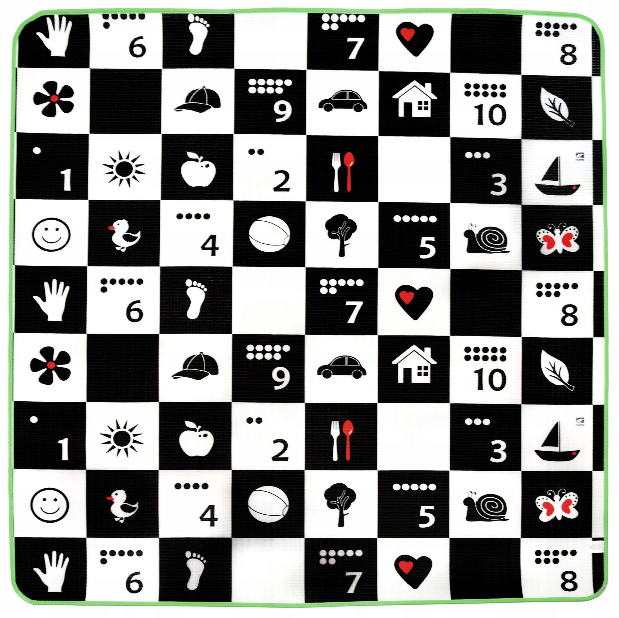 На більш пізньому етапі розвитку дитини килимок сприяє навчанню перші цифри, які знаходяться на контрастній стороні. Біля цифр є крапки, завдяки яким дитині легше зрозуміти поняття кожного числа.