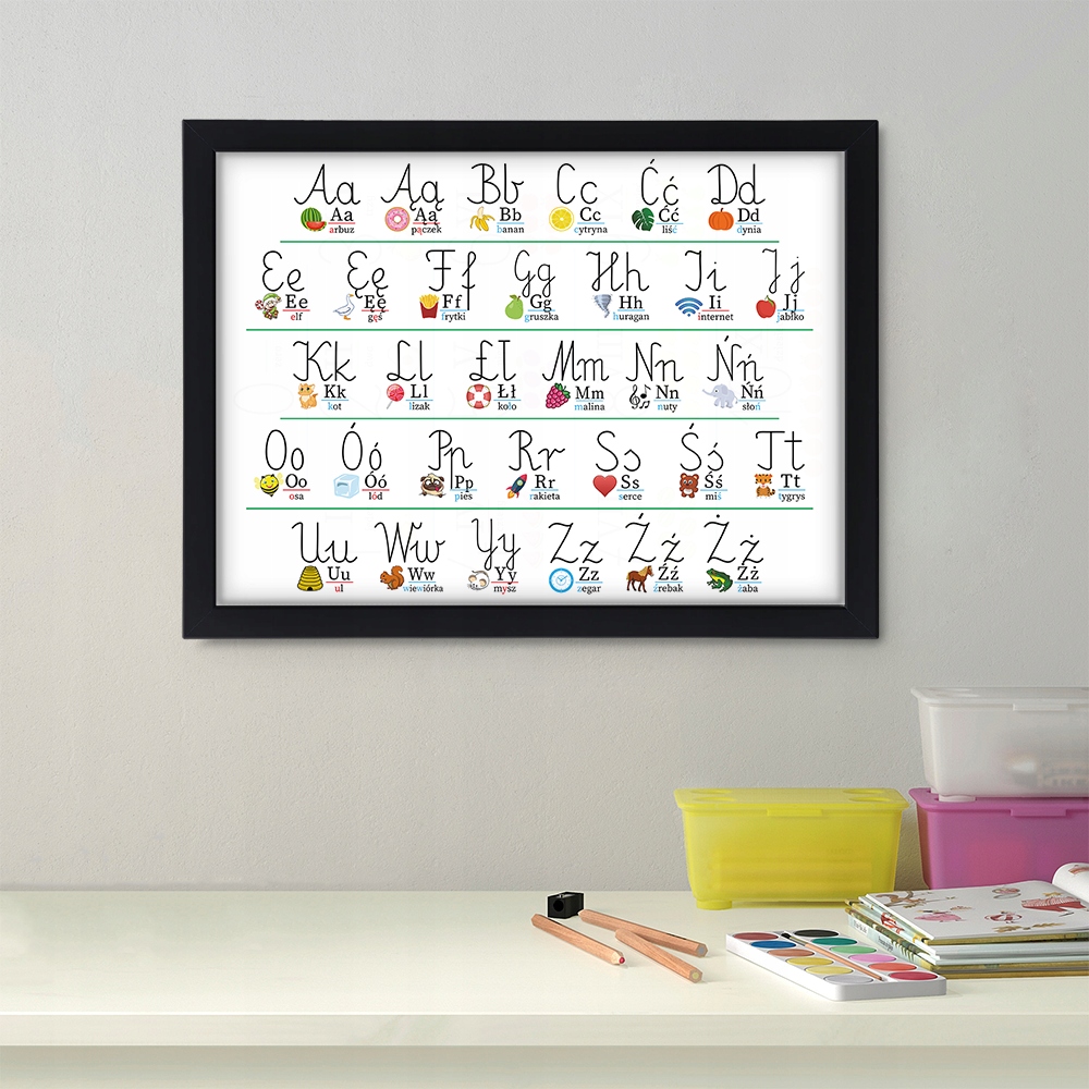 Чудовий плакат для вивчення алфавіту, завдяки якому дитина познайомиться з польським алфавітом – письмовими та друкованими літерами.