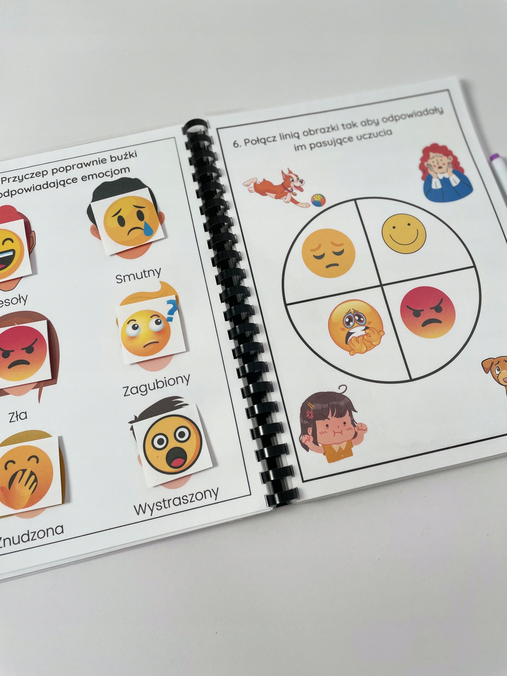 ДИТЯЧА КНИГА ДЛЯ НАВЧАННЯ ЕМОЦІЙ - МАЛЮНКИ НА ЛИПУЧКАХ ТА РУЧКИ В КОМПЛЕКТІ