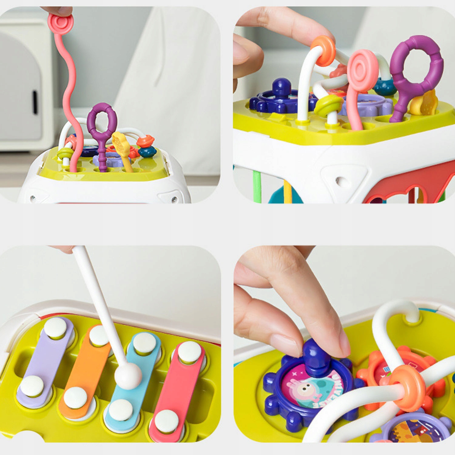 - Знімна панель із міні-ксилофоном, шестерінки, що обертаються, лабіринт із намистинами та шнурками для тягнути.