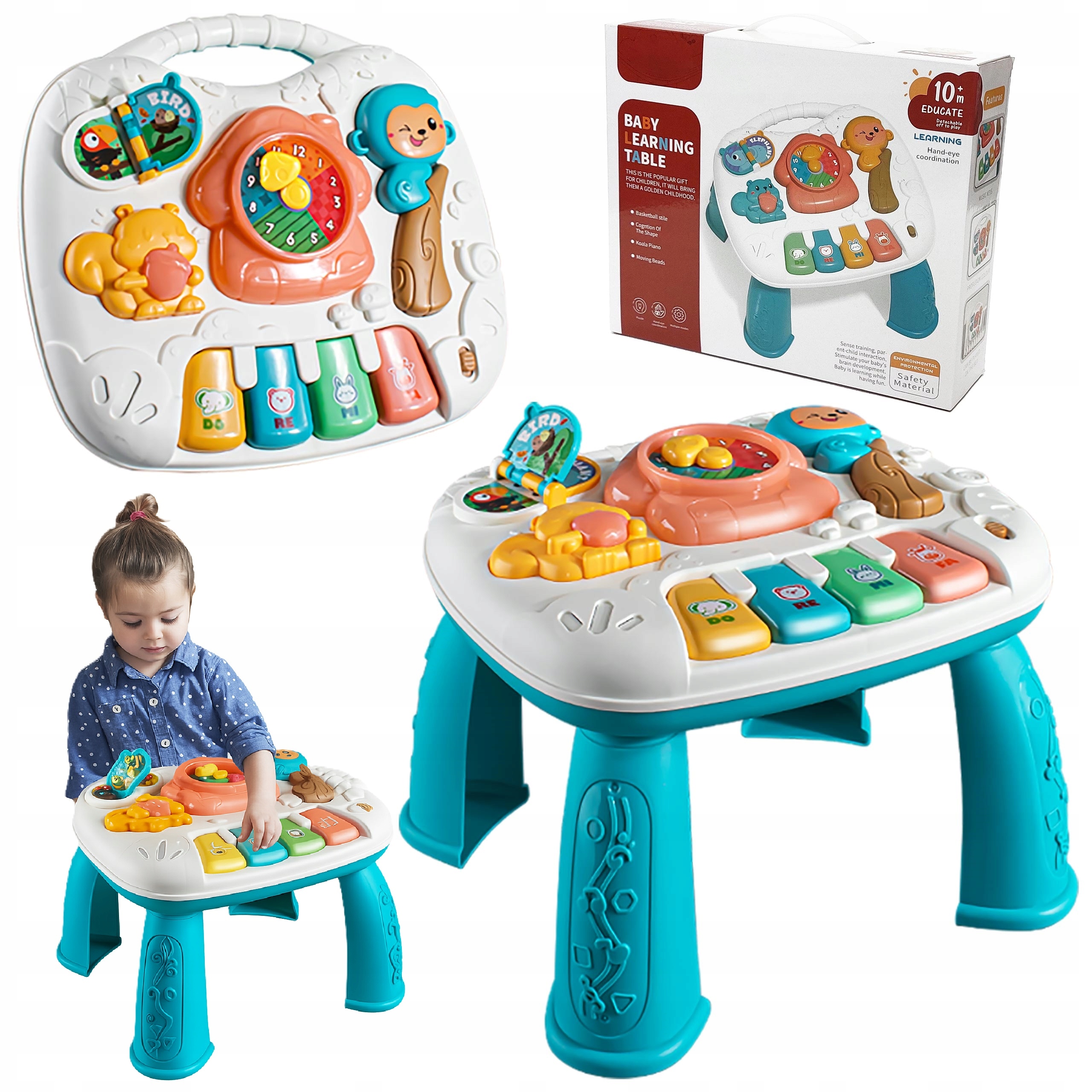 Інтерактивний навчальний стіл — це фантастична іграшка, яка поєднує навчання з розвагою. Кольорові елементи, звуки, музика та рухомі частини стимулюють допитливість дитини та підтримують її розвиток. Виріб можна використовувати на ніжках як столик або без них - як навчальну панель для ліжечка, що робить його надзвичайно універсальним.