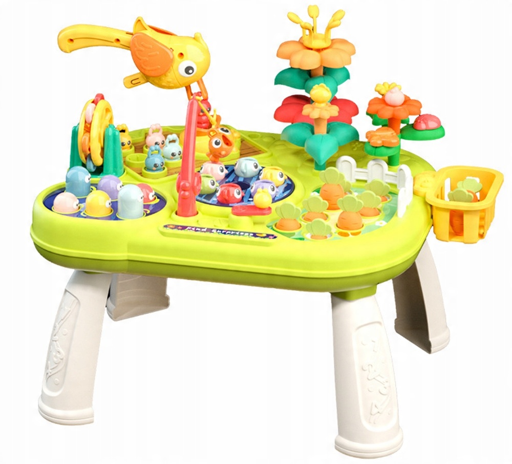 Мультистол, завдяки своїй багатофункціональності, дозволяє дитині розважатися різноманітно, і я гарантую, що іграшка швидко не набридне, адже вона пропонує розваги в рибалці, биті черв'яків молотком, іграх у саду або грати з дятлом у витягування хробака.