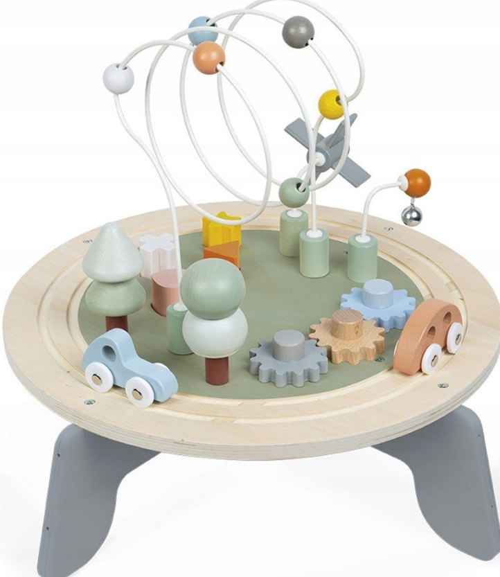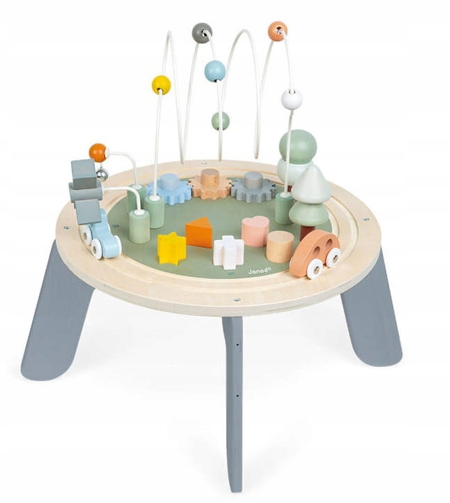 Дерев'яний багатофункціональний навчальний стіл із серії Sweet Cocoon французького бренду JANOD — ідеальна іграшка для дітей від 1 року. Він має безпечну круглу форму та чотири широко розставлені стійкі ніжки, які можна прикріпити двома способами - нижче (стільниця тоді на висоті 14 см) або вище (стільниця на висоті 22.5 см– відповідно до росту малюка. Він радує своєю естетичністю і красивими, «дорослими» кольорами. Елементи на стільниці створюють чарівний мікросвіт, в якому є траса для 2 машин, що входять в набір, петля з 6 кульками для переміщення, дві металеві палички - одна з дерев'яним віялом, що обертається, інша з кулькою з дзвіночком (машини вдаряються під час руху по трасі), 3 зубчасті колеса, 5 блоків різної форми – для розміщення у відповідних отворах (функція сортувальника) та дві ялинки – пірамідки з елементами крони для зняття та встановлення (по 2 на кожну). Іграшка розвиває координацію рухів і дрібну моторику, тренує пам'ять і логічне мислення, вчить розрізняти кольори і форми і навіть помічати причинно-наслідкові зв'язки.