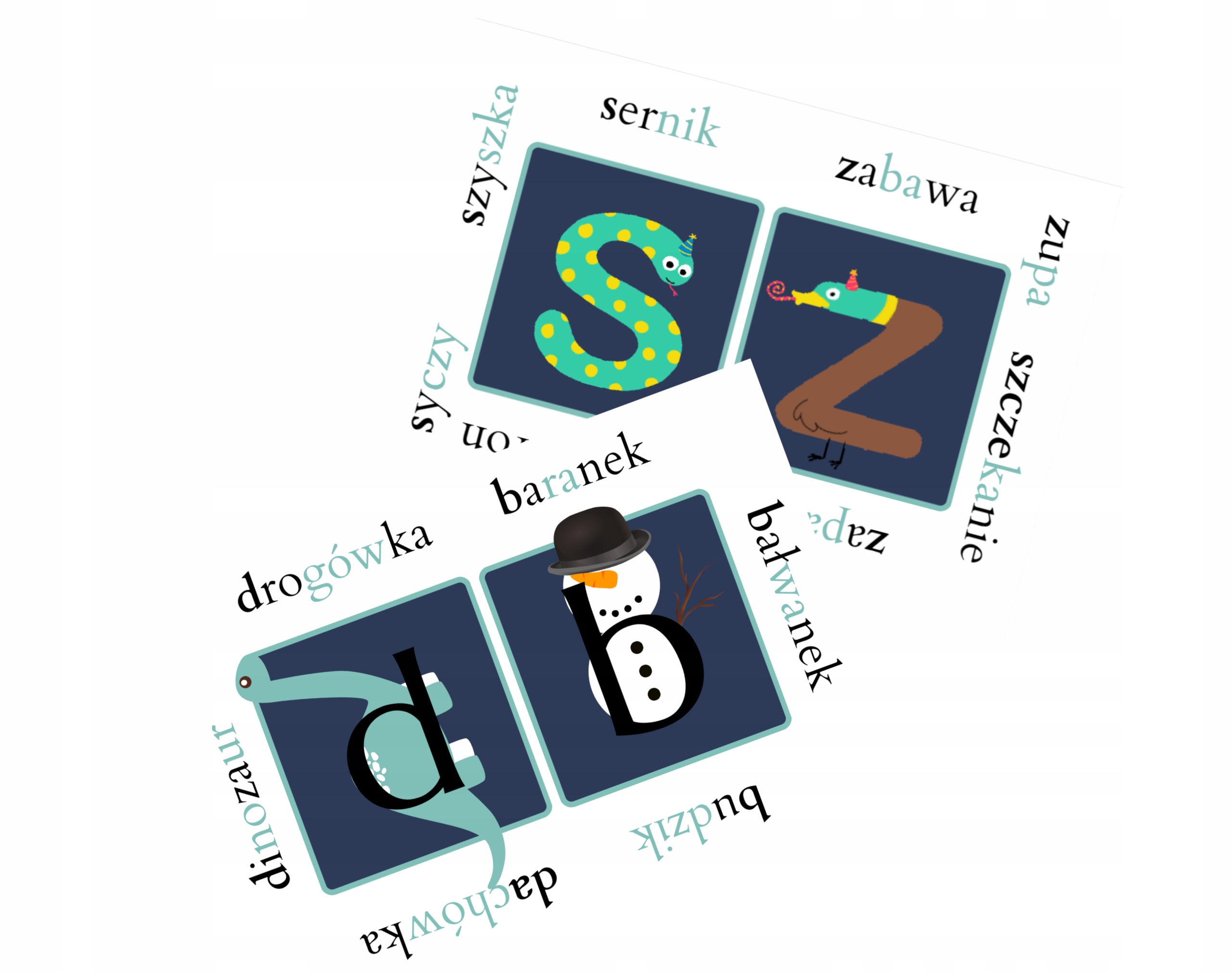 - картки з малими та великими літерами алфавіту та малюнками, які допомагають дітям їх запам'ятати. Крім того, в наших картках ми розширили набір літер, додавши до нього орграфи, які стає важко поєднувати в тексті під час навчання читання. Створено для найменших дітей віком від 3 років, які вивчають букви.