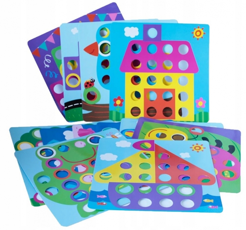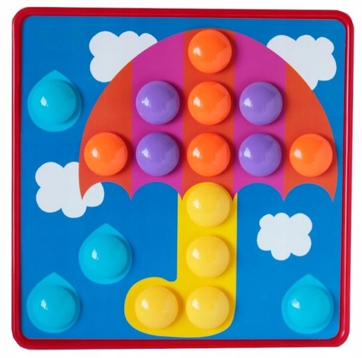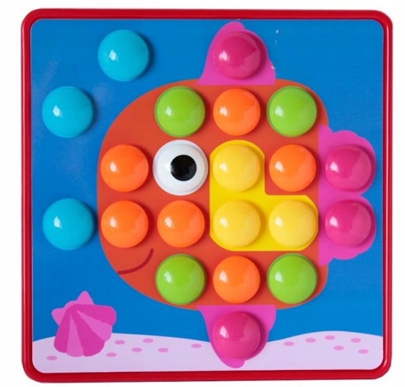 Іграшка має 45 кнопок і 12 різних дощок, на які можна розмістити спеціальна коробка з отворами, на якій ми розставляємо ґудзики.