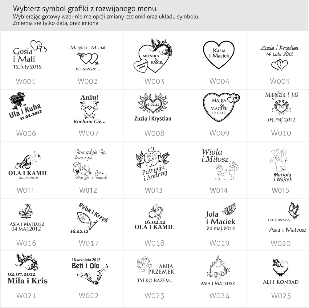 W001 - три серця + імена + дата; W002 - імена + серця, пронизані стрілою + текст "разом назавжди"; W003 - два серця + імена + дата (вписані в серця); W004 - серце + імена; W005- імена + дата + два серця; W006 - серце + імена + дата; W007 - ім'я (він або вона) + сердечко + текст "Я люблю тебе..."; W008 - серце з датою + імена; W009 - імена + дата, написані великим серцем; W010 - імена + серце + дата; W011 - цілуюча пара + імена + дата; W012 - текст "Де ти, там і я..." + пара, що цілується (мультфільм) + імена; W013 - голуби з сердечком з датою + імена; W014 - імена + мультяшна пара; W015 - пара + імена; W016 - тема + імена + дата; W017 - риба + назви + дата; W018 - серце + дата + імена; W019 - аркуш + імена + дата; W020 - голуб + текст "назавжди..." + імена; W021 - тема + дата + імена; W022 - дата + імена + тема; W023 - ангел + імена + текст «тільки разом...»; W034 - серце з датою + імена; W035 - серце + імена