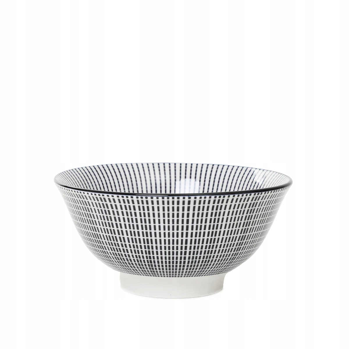Посуд серії NAVIA характеризується простотою форми та екстравагантним, сміливим малюнком. Чаша кругла, її краї злегка розширені, що робить її схожою на квіткову чашку. Він має чорний край, а головною прикрасою є чорний геометричний візерунок, розміщений на білому тлі, що складається з ламаних ліній, що розходяться радіально від центру.
