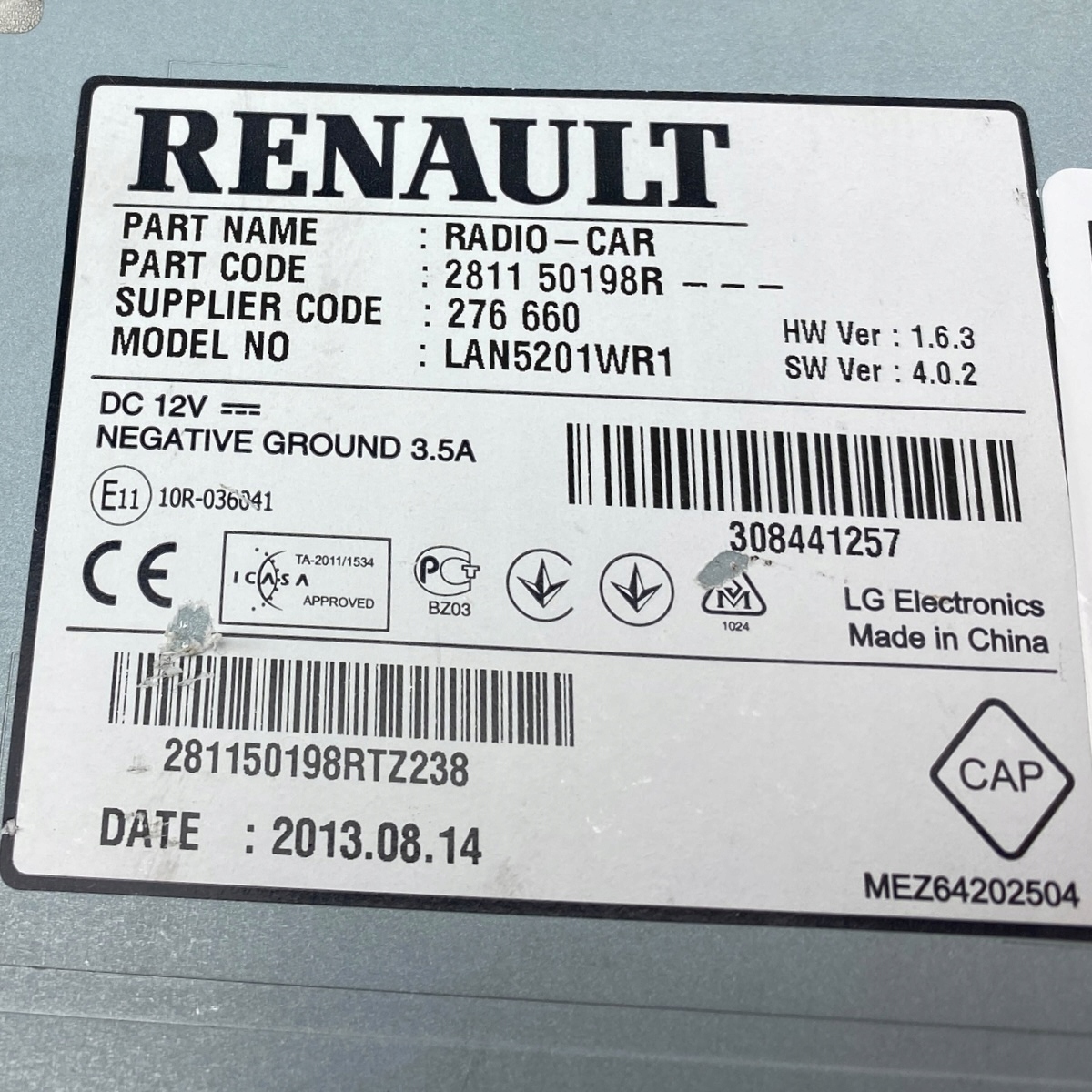 Навігація під час запуску відображає логотип "Renault Logo". Він має два антенні роз'єми (білі та коричневі).