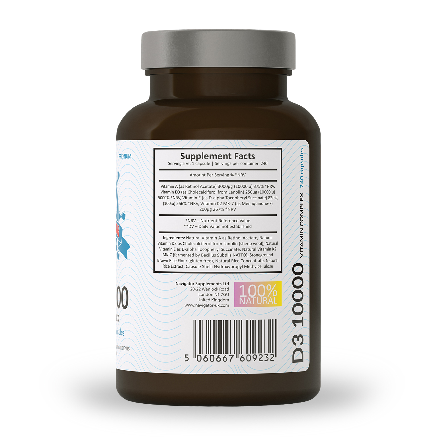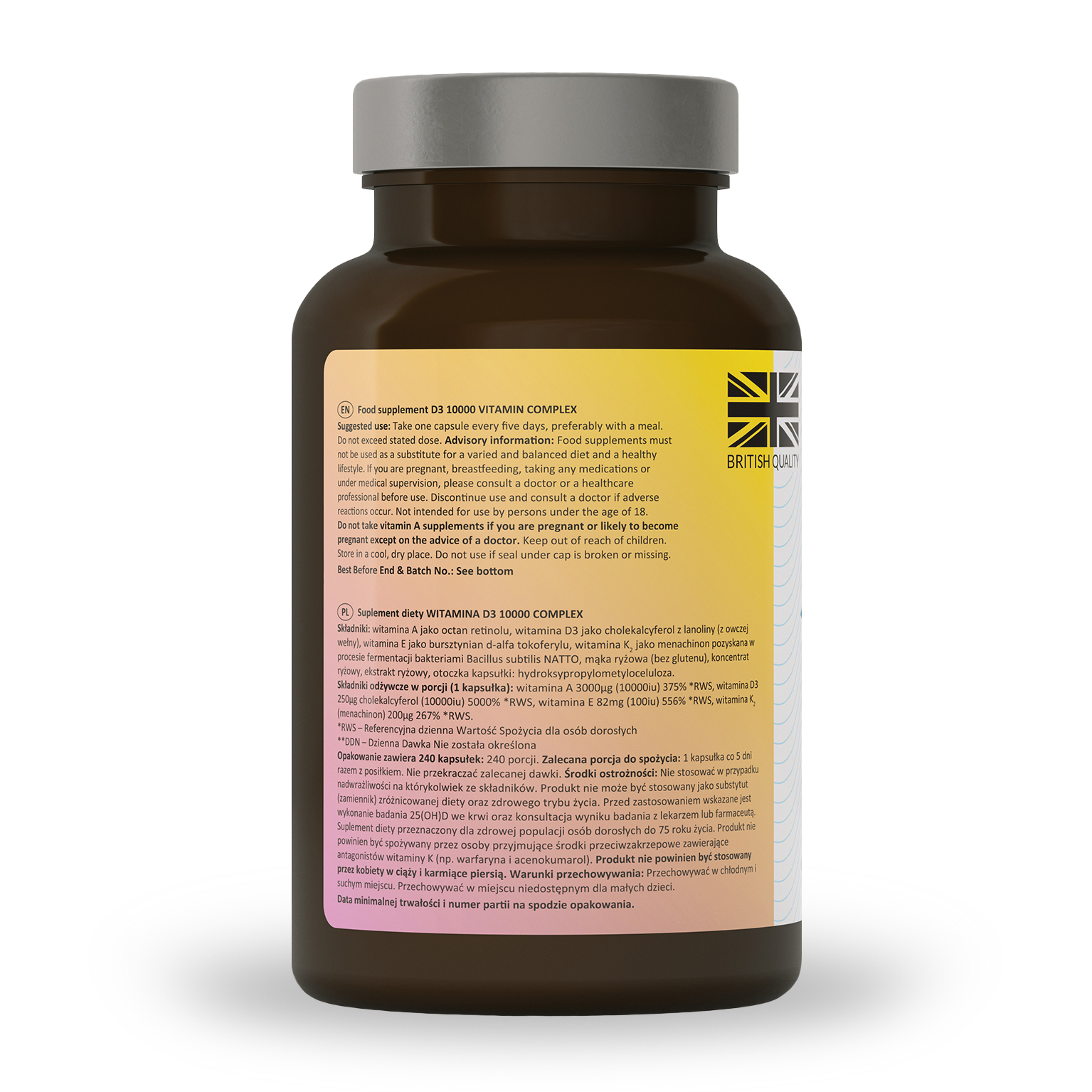 чотири сезони. D3 10 000 вітаміну Комплекс: Вітамін А від сировини природного походження, вітамін D3 з сировини природного походження, вітамін Е із сировини природного походження, вітамін К2 МК-7 від сировини природного походження. Вовна овець), вітамін Е як D-Alfa Tocopheryl Amber, вітамін К2 МК-7 як менахінон, отриманий у процесі бродіння бактерій Bacillus Natto, наповнювальні речовини: рисове борошно (без глютену), рисова концентрація, екстракт рису.