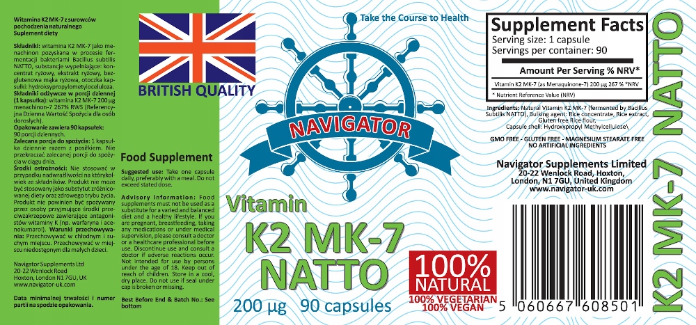 вітамін К2 МК-7 (менахінон-7), отриманий з природної сировини в процесі бродіння гліцину. Bacteria Bacillus subtilis natto, 200 мкг , 90 капсул, вироблених у Великобританії Лондонською компанією Navigator Delptes Limited. продукт 100% натуральної сировини. 100% вегетаріанський продукт. 100% веганський продукт. Усі компоненти сертифікованих та безпечних капсул.