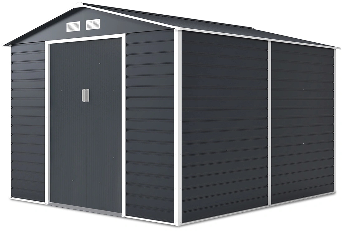 Холодний сірий будинок MONTREAL 9x10 - універсальний сарай для інструментів з розсувними дверима. Це ідеальне місце для зберігання інструментів, велосипедів, газонокосарки та садового обладнання. Все було зроблено з високоякісних матеріалів - оцинкованої сталевої рами та гарячеоцинкованих сталевих панелей товщиною 0,25 мм. Це забезпечує найкращу міцність, стабільність, довговічність і стійкість до погодних умов і корозії. Двосхилий дах запобігає накопиченню води та снігу, забезпечуючи таким чином безпечне використання. Чотири вентиляційні отвори та додаткове вікно забезпечують достатню циркуляцію повітря. Будинок готовий до монтажу.