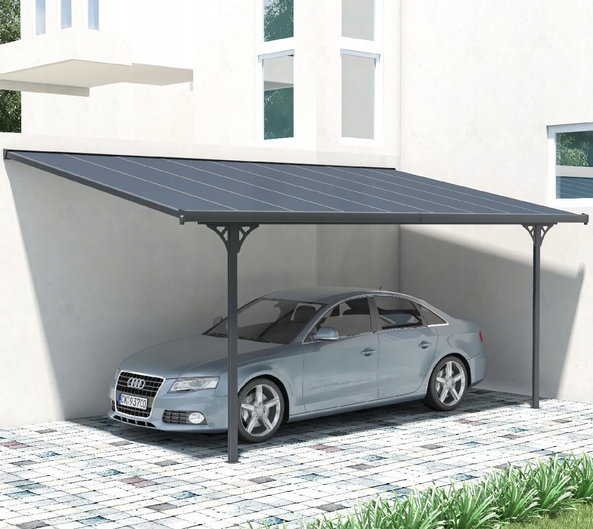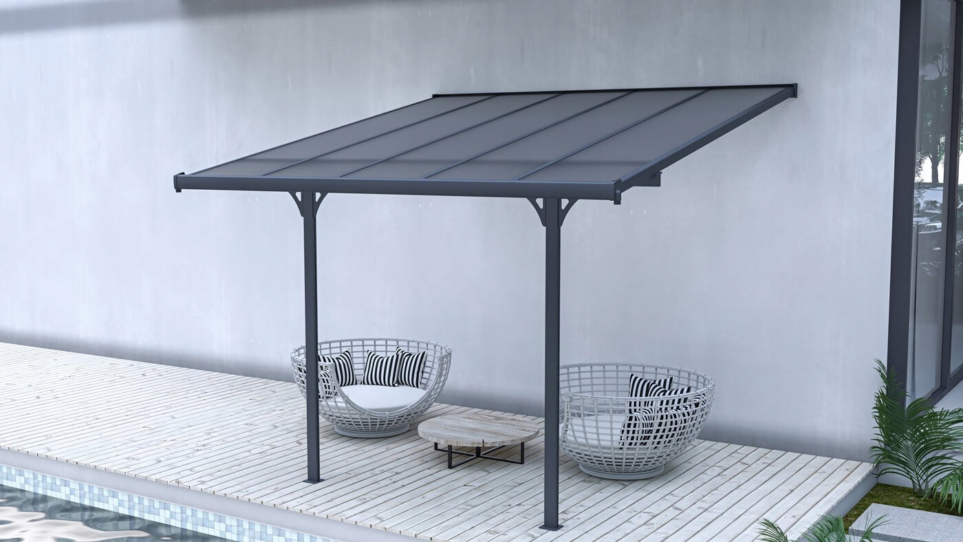 Навіс виготовлений з міцного алюмінію, пофарбованого в елегантний сірий колір, який легко поєднується зі стилем вашого будинку та саду. Алюміній також стійкий до погодних умов і корозії, що гарантує довговічність і легкість в обслуговуванні конструкції. Покрівля ATLANTA виготовлена з високоякісного полікарбонату і є 100% водонепроникною, що означає, що ваша тераса буде захищена від дощу, снігу та інших погодних умов. Крім того, полікарбонат чудово фільтрує УФ-випромінювання, забезпечуючи Ваш комфорт і безпеку.