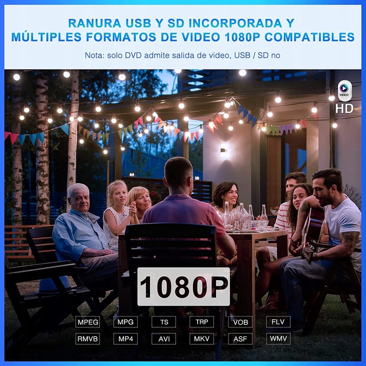 【DVD Region Free】 Підтримує відтворення в усьому регіоні та сумісний із DVD/CD/MP3/VCD/SVCD/DVD-5/DVD-9 та іншими медіаформатами, такими як MP4/MKV /MPG/TS/TRP/VOB / FLV / RMVB / AVI / MOV / ASF / WMV. Інтегрований слот для карт USB/SD (до 128 ГБ, FAT32)