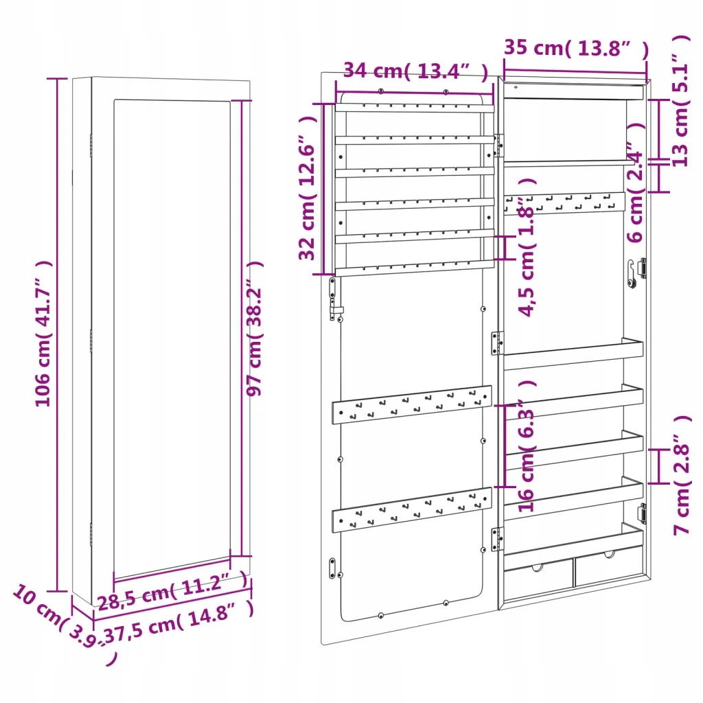 - Багато місця для зберігання: дзеркальна шафа оснащена 2 висувними ящиками та великою кількістю гачків, вішалок і полиць, де ви можете упорядкуйте свої прикраси під рукою.