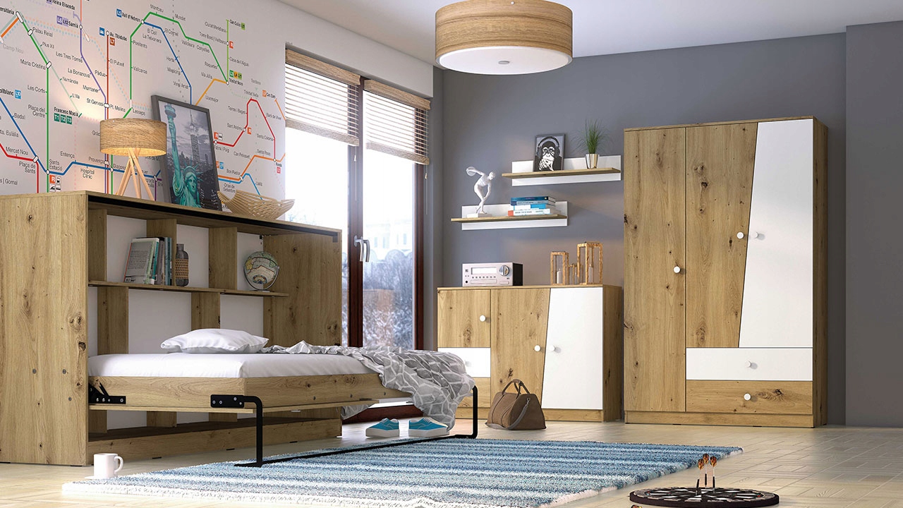 Меблева система Nero це поєднання сучасного стилю та функціональності. Гарнітури, складені з елементів колекції, особливо добре підійдуть для підліткової кімнати.